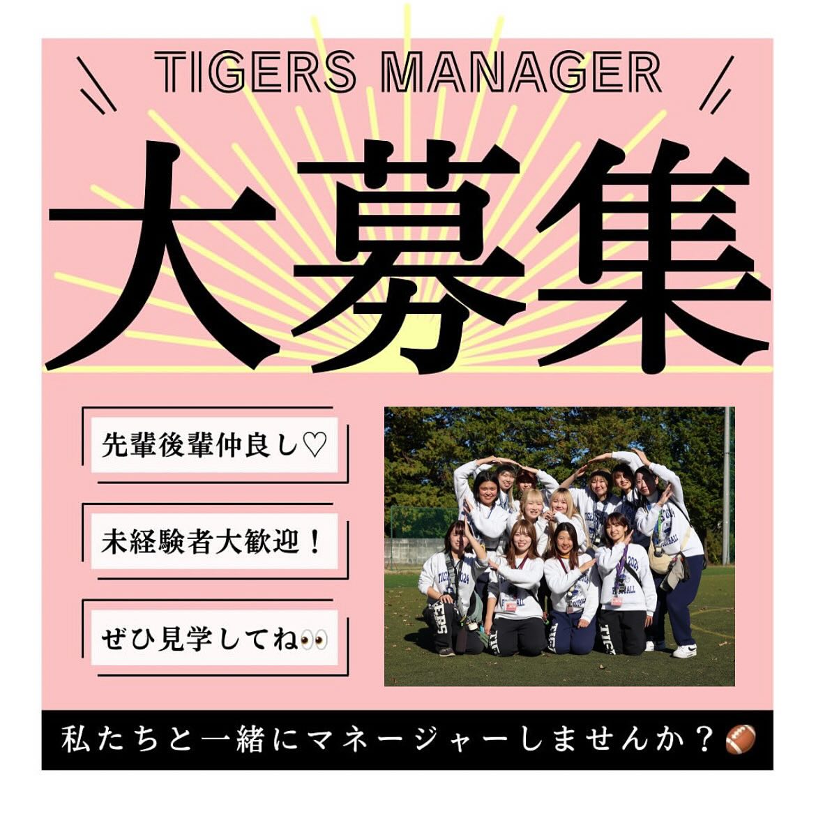 【マネージャー大募集】 「マネージャーやったことないしな…」 「マネージャーって応援してるだけ?」 なんて思っているそこのあなた! マネージャーがチームの成長を促していると言っても過言ではないくらい、マネージャーの役割は大きいんです マネージャー未経験でもなんの問題もなし!優しくて可愛い先輩マネージャーがあなたを敏腕マネージャーへと成長させてくれます 最後の青春、私たちと一緒にTIGERSマネージャーとして自他共に成長しませんか? ┈┈┈┈┈┈┈┈┈┈ 見学・体験いつでもお待ちしています🏻 1人でも、お友だちとでも、途中参加・退出ももちろんOKです!見学の場合は私服で、体験の場合はぜひ動きやすい格好でお越しください!動きやすい服がない場合は貸出も行います ※練習日時は変更する場合があります。見学・体験を希望する方はぜひDMへご連絡ください 春休み期間練習(3/9~3/31) 晴天時:五十嵐キャンパス サッカー・ラグビー場 雨天時:五十嵐キャンパス第2体育館Bフロア 日時:水~日曜 9:00~12:00 質問などもDMでいつでも受け付けています! アメフト部のことだけでなく新生活に関することなど、どんな些細なことでもお気軽にご連絡ください🏻