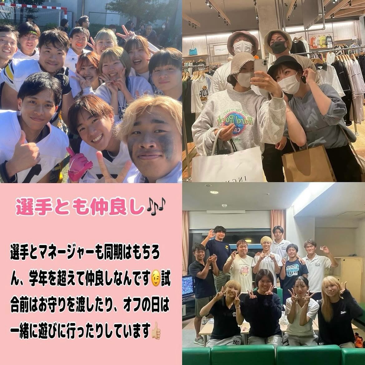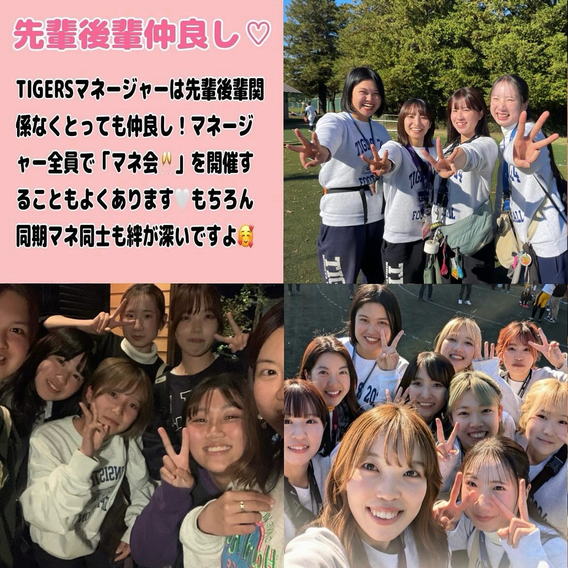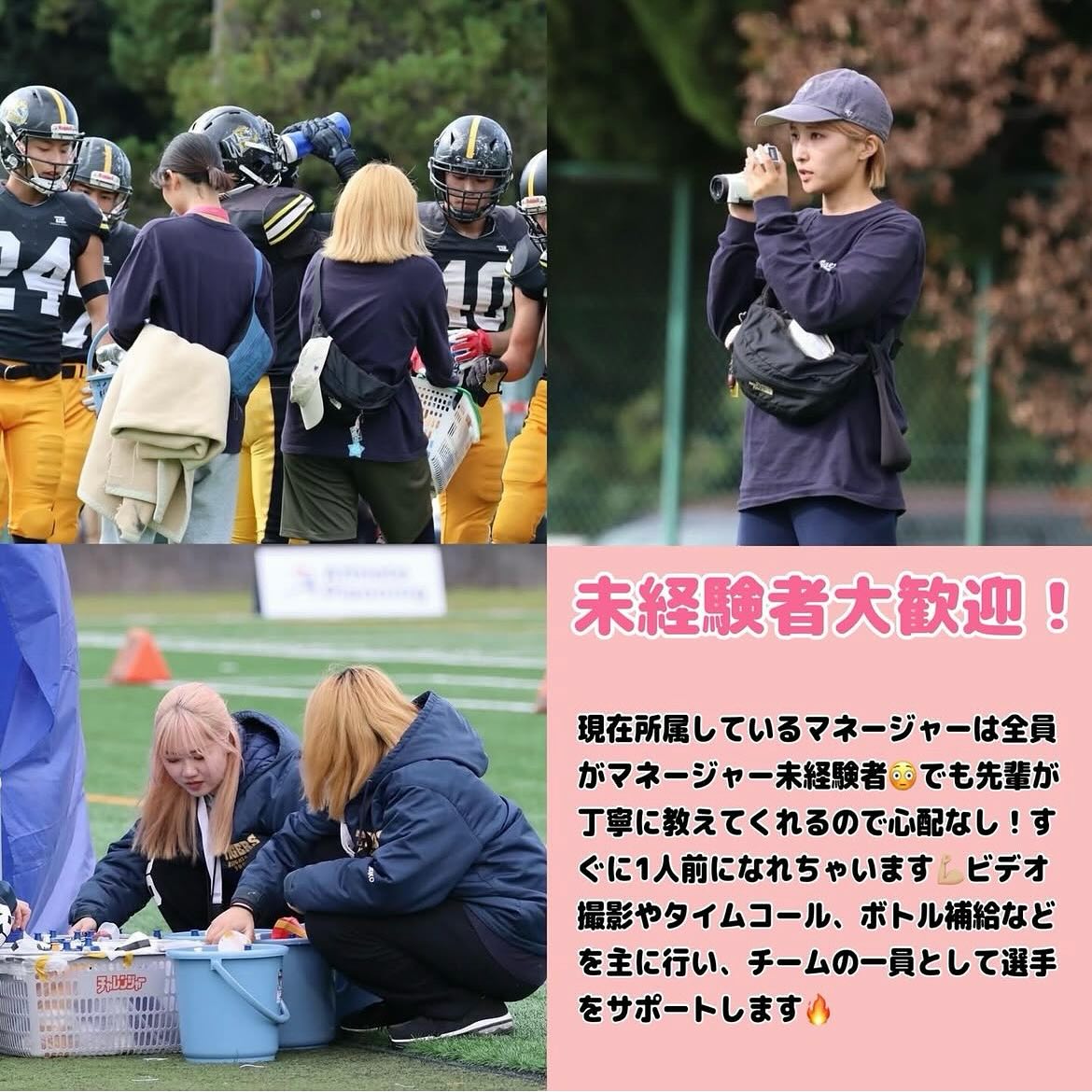 - 【マネージャー大募集】 「マネージャーやったことないしな…」 「マネージャーって応援してるだけ?」 なんて思っているそこのあなた! マネージャーがチームの成長を促していると言っても過言ではないくらい、マネージャーの役割は大きいんです マネージャー未経験でもなんの問題もなし!優しくて可愛い先輩マネージャーがあなたを敏腕マネージャーへと成長させてくれます 最後の青春、私たちと一緒にTIGERSマネージャーとして自他共に成長しませんか? ┈┈┈┈┈┈┈┈┈┈ 見学・体験いつでもお待ちしています🏻 1人でも、お友だちとでも、途中参加・退出ももちろんOKです!見学の場合は私服で、体験の場合はぜひ動きやすい格好でお越しください!動きやすい服がない場合は貸出も行います ※練習日時は変更する場合があります。見学・体験を希望する方はぜひDMへご連絡ください 春休み期間練習(3/9~3/31) 晴天時:五十嵐キャンパス サッカー・ラグビー場 雨天時:五十嵐キャンパス第2体育館Bフロア 日時:水~日曜 9:00~12:00 質問などもDMでいつでも受け付けています! アメフト部のことだけでなく新生活に関することなど、どんな些細なことでもお気軽にご連絡ください🏻