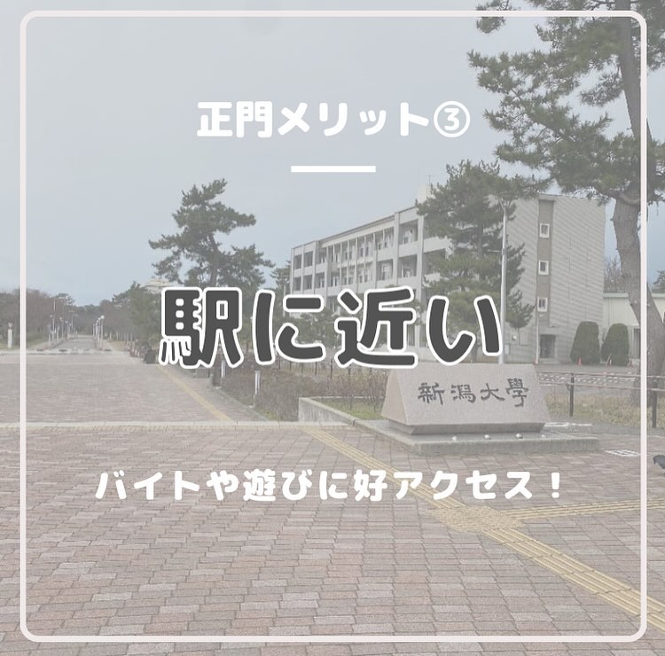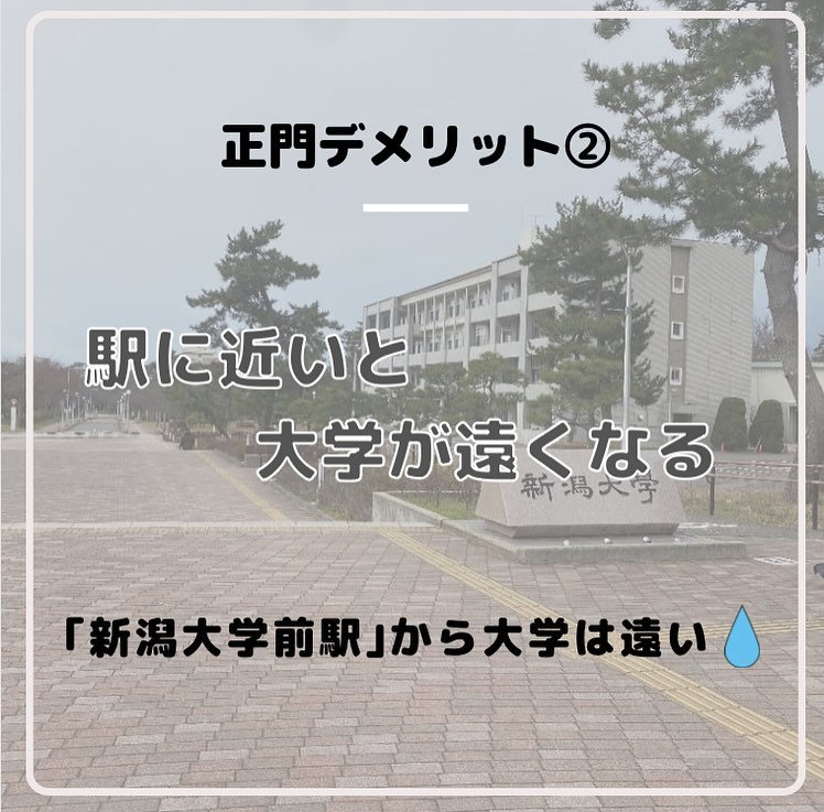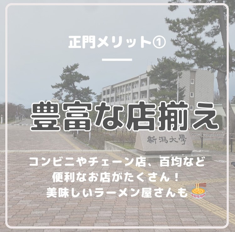 - 【現役新大生に聞く!新生活情報】 春から新大生のみなさん、ぜひアパート選びの参考にしてください 第2回目は”正門編”です! 〜メリット〜 ①『豊富な店揃え』 LAWSON、セブンイレブンなどのコンビニエンスストアはもちろん、すき家や松屋、Seria(百均)など様々なチェーン店が並んでいます!少し坂を下ればマクドナルドやカラオケまねきねこもあるので充実なぜかラーメン屋と薬局が特に多いです ②『自炊大変だよね…?』 朝と晩のご飯付きのでアパート多数栄養バランスの取れた日替わりのメニューでお腹いっぱいになれます自炊が面倒な時に助かること間違いなし! ③『駅に近い』 正門エリアは新潟大学前駅まで平均5~10分程度なので好アクセスなんです電車でバイトや遊びに行く時は遅刻しづらいかもしれません? 〜デメリット〜 ①『家賃が高い…』 利便性が高かったりご飯付きだったりする分、家賃は少し高めでもその分暮らしやすさはダントツです ②『駅に近いと大学が遠くなる』 大学から新潟大学前駅まで距離があるので駅に近いと大学が遠くなるというジレンマが?駅に近い人は少し早起きしないと遅刻しちゃうかも? 次回は“中門編“です!お楽しみに #