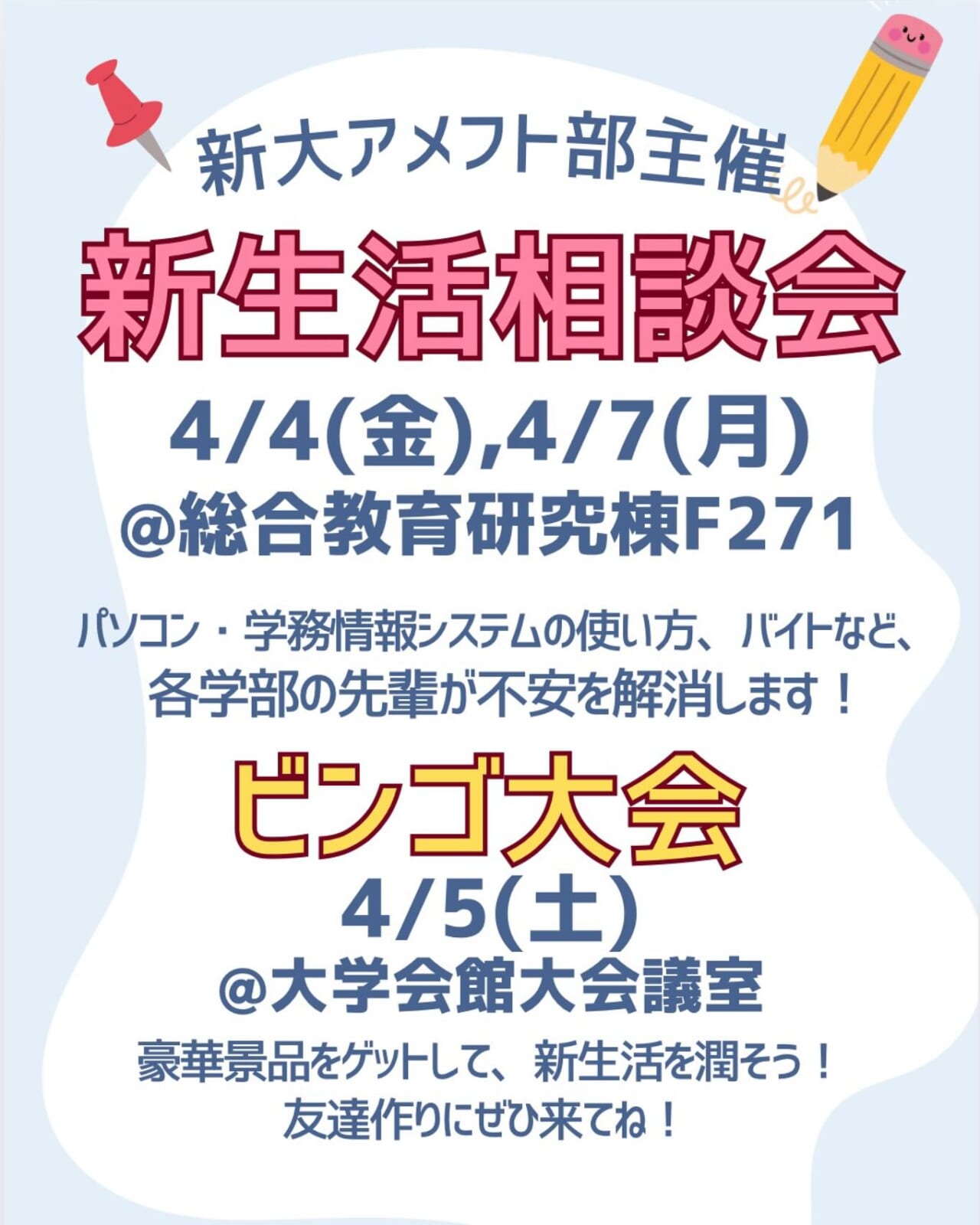 ãð£ïžæ°ç掻çžè«äŒïŒãã³ãŽå€§äŒã ãæ°çæŽ»çžè«äŒã 4/4(é)ã4/7(æ) @ç·åæè²ç ç©¶æ£F271 ããã³ãŽå€§äŒã 4/5(å) @倧åŠäŒé€š 倧äŒè°å®€ çžè«äŒã§ã¯çæ§ãæ±ãã倧åŠç掻ãžã®äžå®ããæ§ã ãªåŠéšã®ã¢ã¡ããéšå¡ãå šåã§è§£æ¶ã»ãµããŒãããããŸãïŒ ã¬ã€ãã³ã¹ã§åãããªãã£ãããšãã倧åŠç掻ããã€ãã®ããšãªã©ããªãã§ãèããŠãã ããð» ãããŠæšå¹Žãå€§çæ³ã ã£ããã³ãŽå€§äŒãä»å¹Žãéå¬ããŸãïŒ è±ªè¯æ¯åãã²ããããŠãçŽ æµãªæ°ç掻ãã¹ã¿ãŒããããã ââââââââââ èŠåŠã»äœéšãã€ã§ããåŸ ã¡ããŠããŸãð» 1人ã§ãããåã ã¡ãšã§ããéäžåå ã»éåºããã¡ããOKã§ãïŒèŠåŠã®å Žåã¯ç§æã§ãäœéšã®å Žåã¯ãã²åããããæ Œå¥œã§ãè¶ããã ããïŒåããããæããªãå Žåã¯è²žåºãè¡ããŸã â»æ¥æã¯å€æŽããå ŽåããããŸããèŠåŠã»äœéšãåžæããæ¹ã¯ãã²DMãžãé£çµ¡ãã ãã æ°ææéç·Žç¿ æŽå€©æïŒäºååµãã£ã³ãã¹ ãµãã«ãŒã»ã©ã°ããŒå Ž éšå€©æïŒäºååµãã£ã³ãã¹ç¬¬2äœè²é€šBããã¢ æ¥æïŒæ°Ž~éæ 17:00~ åã»æ¥æ 9:00~12:00 質åãªã©ãDMã§ãã€ã§ãåãä»ããŠããŸãïŒ ã¢ã¡ããéšã®ããšã ãã§ãªãæ°ç掻ã«é¢ããããšãªã©ãã©ããªäºçްãªããšã§ããæ°è»œã«ãé£çµ¡ãã ããð» #