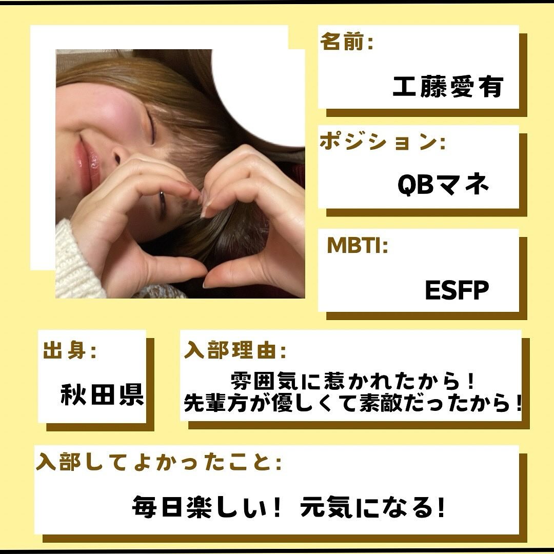 - 【TIGERS 2025 部員紹介】 新2年スタッフ編 『アメフト部の不思議ちゃん代表』 MG 工藤愛有 ・出身:秋田県 ・MBTI:ESFP ・中学部活:陸上部 ・高校部活:陸上部 ・学部・学年:教育学部・2年 ・ポジション:QBマネージャー ・入部理由:雰囲気に惹かれたから!先輩方が優しくて素敵だったから! ・入部してよかったこと:毎日楽しい!元気になる! ・新大近くのおすすめご飯屋さん:けん軒 ・アルバイト:塾講師 #
