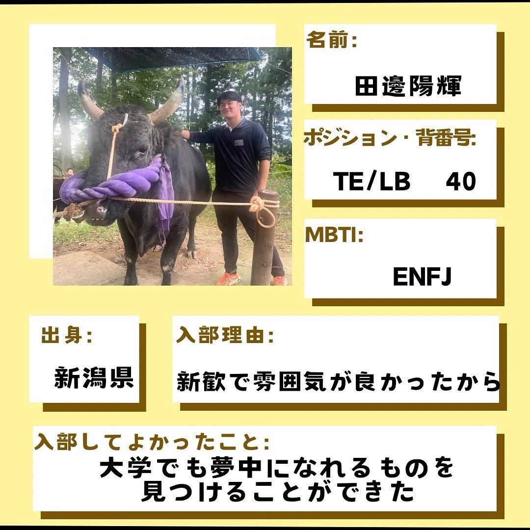 - 【TIGERS 2025 部員紹介】 新4年選手編② 『アメフト部の大腿四頭筋代表!』 田邊陽輝 ・出身:新潟県 ・MBTI:ENFJ ・中学部活:陸上 ・高校部活:陸上 ・学部・学年:農学部・4年 ・ポジション:TE、LB ・入部理由:新歓で雰囲気が良かったから ・入部してよかったこと:大学でも夢中になれるものを見つけることができた ・新大近くのおすすめご飯屋さん:たんたん ・アルバイト:McDonald #
