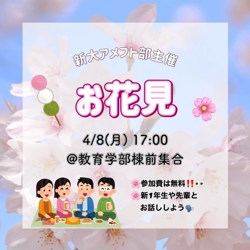 【お花見】 4/8(月) 17:00 教育学部棟前集合 今年はお花見を開催します 綺麗な桜を見ながらアメフト部員と楽しくおしゃべりして大学生活の不安や疑問を解消しよう!先輩だけではなくいろいろな学部の1年生と知り合えるチャンスでもあります さらに「花より団子」派のみなさんのためにおいしいごはんも用意しています🏻 アレルギー等の不安がある方はお気軽にご相談ください🏻 ️また、新潟の夜はまだまだ冷えるので上着の準備をよろしくお願いします! 参加費は無料️ 途中参加・退出もOK! 参加連絡や質問はDMまでお気軽にお願いしますもちろん当日参加も大歓迎です!!! たくさんのご参加お待ちしております🤲🏻 ┈┈┈┈┈┈┈┈┈ アメフト部への見学・体験いつでもお待ちしています🏻 1人でも、お友だちとでも、途中参加・退出ももちろんOKです!見学の場合は私服で、体験の場合はぜひ動きやすい格好でお越しください! ※練習日時は変更する場合があります。見学・体験を希望する方はぜひDMへご連絡ください 新歓期間練習 晴天時:五十嵐キャンパス サッカー・ラグビー場 雨天時:五十嵐キャンパス第2体育館Bフロア 日時:水~金 17:00~ 土日 9:00~12:00 質問などもDM・ハイライトの質問箱でいつでも受け付けています! アメフト部のことだけでなく新生活に関することなど、どんな些細なことでもお気軽にご連絡ください🏻 #