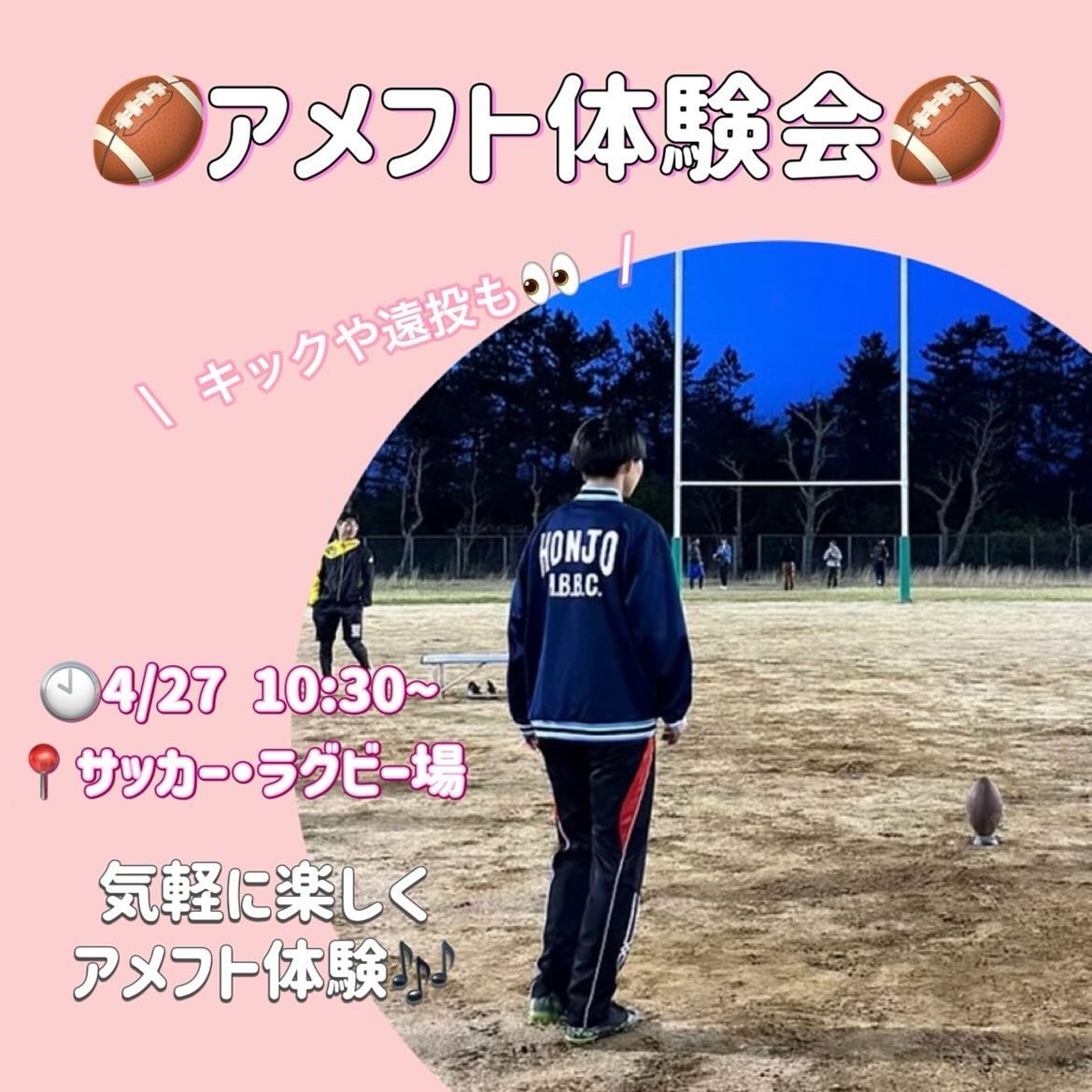 【アメフト体験会】 4/27(土) 10:30~ サッカー・ラグビー場 4/27(土)は、アメフト体験会を行います アメフト体験会では、アメフト要素のあるレクリエーションを行います!! 遠投やキックなどなど、だれでもチャレンジできる種目ばかりなので男の子🏻も女の子🏻もぜひご参加ください!🏻 実際のアメフトを体験しながら、みんなで楽しく盛り上がりましょう ┈┈┈┈┈┈┈┈┈ アメフト部への見学・体験いつでもお待ちしています🏻 1人でも、お友だちとでも、途中参加・退出ももちろんOKです!見学の場合は私服で、体験の場合はぜひ動きやすい格好でお越しください! ※練習日時は変更する場合があります。見学・体験を希望する方はぜひDMへご連絡ください 新歓期間練習 晴天時:五十嵐キャンパス サッカー・ラグビー場 雨天時:五十嵐キャンパス第2体育館Bフロア 日時:水~金 17:00~ 土日 9:00~12:00 質問などもDM・ハイライトの質問箱でいつでも受け付けています! アメフト部のことだけでなく新生活に関することなど、どんな些細なことでもお気軽にご連絡ください🏻 #
