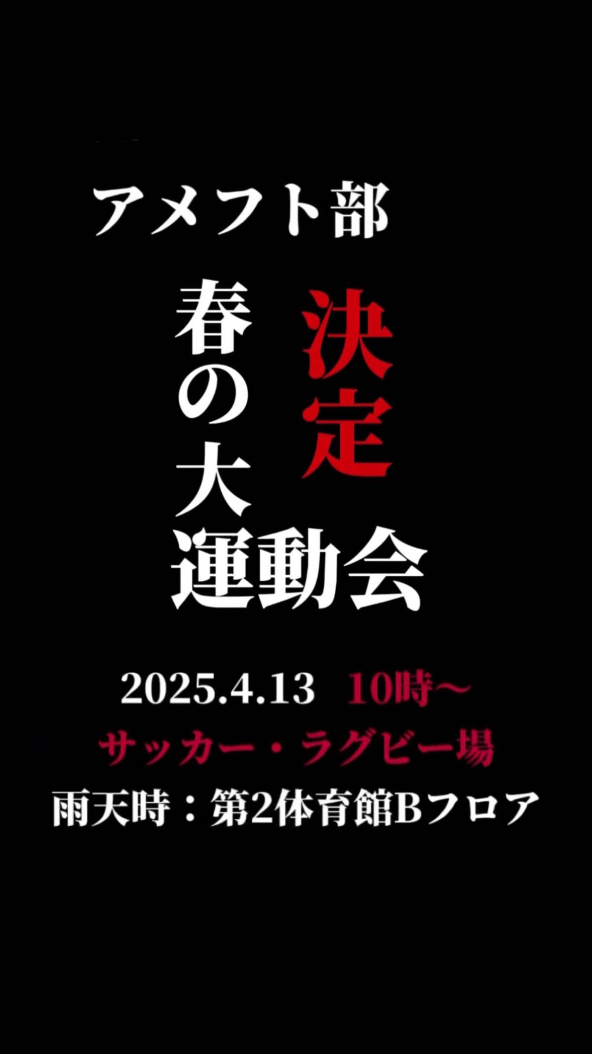【アメフト部春の大運動会】 〈日時・場所〉 4/13(日)10:00~ サッカーラグビー場(雨天時:第2体育館Bフロア) 毎年多くの新入生が参加する【アメフト部春の大運動会】!今年も開催します 運動が苦手な子も、男女問わず楽しめる競技を用意しています! 人生最後の運動会?!チーム対抗なので、新入生同士の交流も深められること間違いなし! おひとりでも、お友達とでも大歓迎です!一緒に楽しく体を動かしましょう ぜひ動きやすい格好でお越しください🤲🏻 ※服や靴の貸出もございます! 会場への行き方は【行き方動画】をチェック! ご質問やご相談はDMまでお願いします ┈┈┈┈┈┈┈┈┈┈ 見学・体験いつでもお待ちしています🏻 1人でも、お友だちとでも、途中参加・退出ももちろんOKです!見学の場合は私服で、体験の場合はぜひ動きやすい格好でお越しください!動きやすい服がない場合は貸出も行います ※日時は変更する場合があります。見学・体験を希望する方はぜひDMへご連絡ください 新歓期間練習 晴天時:五十嵐キャンパス サッカー・ラグビー場 雨天時:五十嵐キャンパス第2体育館Bフロア 日時:水~金曜 17:00~ 土・日曜 9:00~12:00 質問などもDMでいつでも受け付けています! アメフト部のことだけでなく新生活に関することなど、どんな些細なことでもお気軽にご連絡ください🏻 #