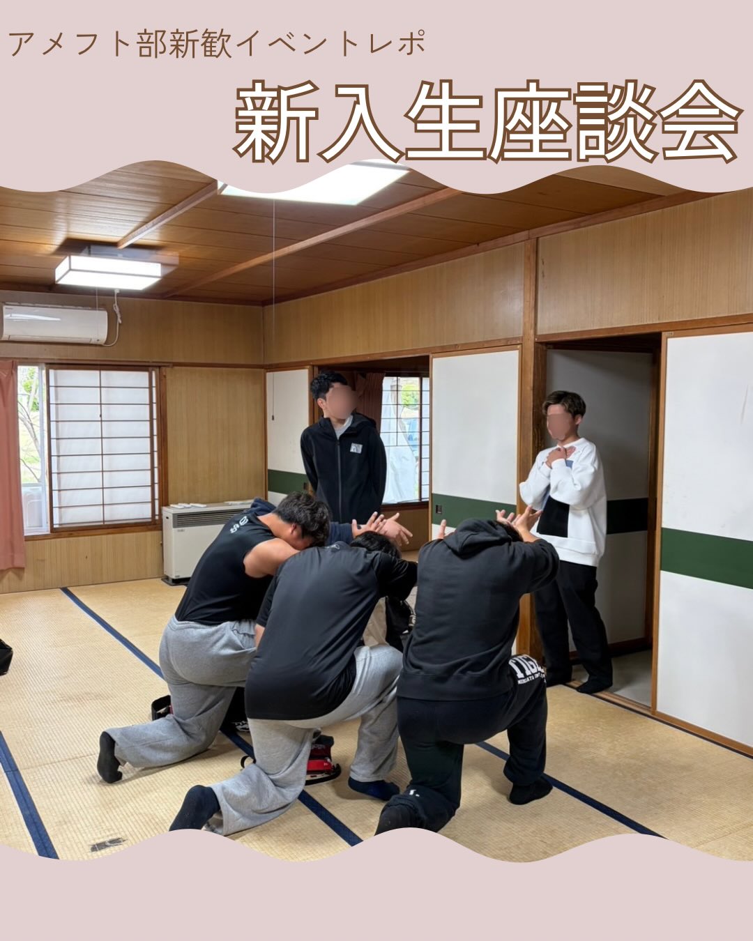 - 【イベントレポ~新入生座談会~】 4/5(日)に新入生座談会を開催しました! ガイダンス前のイベントにも関わらず、2名の新入生が参加してくれました️ 座談会では大学生活の不安なことを相談したり、ボードゲームで遊んだりと、部員と新入生の親睦を深めることができました 次回イベント 《新入生相談会》 4/6(月)4/7(火) 13:00~ 4/6(月) 13:00〜16:30 大学会館 中集会室 16:30〜 総合教育研究棟 F271 4/7(火) 大学会館 中集会室 ーーーーーーー 見学・体験いつでもお待ちしています🏻 1人でも、お友だちとでも、途中参加・退出ももちろんOKです!見学の場合は私服で、体験の場合はぜひ動きやすい格好でお越しください!動きやすい服がない場合は貸出も行います ※練習日時は変更する場合があります。見学・体験を希望する方はぜひDMへご連絡ください! 練習詳細 晴天時:五十嵐キャンパス サッカー・ラグビー場 雨天時:※練習時間、練習場所が変わる可能性があります。見学・体験希望の方はDMまでお問い合わせお願いいたします!🏻♀️ 日時:火〜木曜 17:00~ 土・日曜 9:00~ 質問などもDMでいつでも受け付けています! アメフト部のことだけでなく新生活に関することなど、どんな些細なことでもお気軽にご連絡ください!