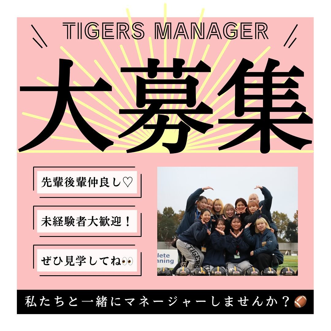 【マネージャー大募集️】 「マネージャーやったことないしな…」 「マネージャーって応援してるだけ?」 なんて思っているそこのあなた! マネージャーがチームの成長を促していると言っても過言ではないくらい、マネージャーの役割は大きいんです マネージャー未経験でもなんの問題もなし!優しくて可愛い先輩マネージャーがあなたを敏腕マネージャーへと成長させてくれます 最後の青春、私たちと一緒にTIGERSマネージャーとして自他共に成長しませんか?
