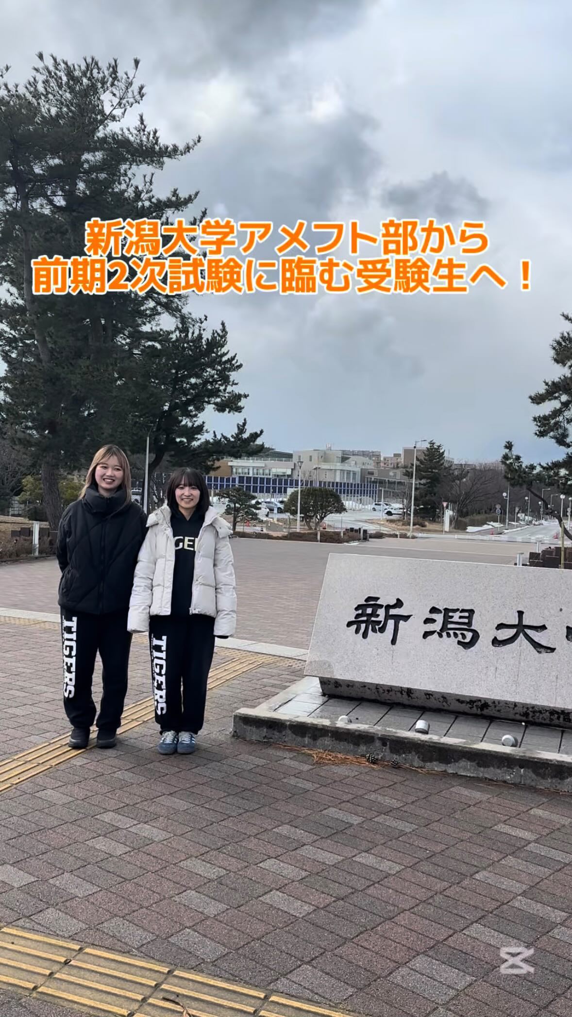 【前期試験受験生へプチアドバイス】 いよいよ明日は新潟大学の前期2次試験ですね! 今回は受験を明日に控えた受験生の皆様に向けて、新潟大学の正門にてメッセージ動画を撮影しました! 実際の新潟大学の様子ものぞいて見てください 体調を万全に整えて明日に備えましょう! 新大アメフト部TIGERS一同、皆様が全力を出し切れるよう応援しています🏻 #二次試験前期日程 # View this post on Instagram A post shared by 新潟大学アメフト部TIGERS新歓2025 (@tigers_recruit_)