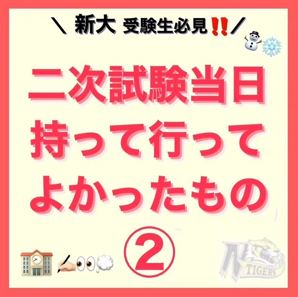 【受験生必見】二次試験に持っていってよかったものpart ② いよいよ明日から二次試験 前回のpart①に引き続き、二次試験に実際に持っていってよかったものを紹介します! 特に新大を受験する皆さんは必見です 4、次の日のテストの勉強に使うもの 二次試験1日目が終了すると、答案確認のため、試験室にしばらくの間残っていなければなりません。その間、スマートフォンなどの電子機器の使用も禁止されます。次の日のテストのため、勉強できる準備をしておくと、時間を有効活用できます!その日の出来は置いておいて、気持ちを切り替えて2日目に備えましょう!最終日は暇つぶしの本を持っていくのもいいと思います🏻 5、脱ぎ着できる服装 他の受験生の要望から空調が調節され、自分にとっては暑かったり寒かったりする場合があります。また、換気のため試験室を開放すると、一気に体が冷えてしまいます。脱ぎ着できて、体温調節が可能な服を着ていくことをおすすめします! 6、最後に 受験票、筆記用具は必ず持っていきましょう!!これさえあれば受験できます。また、手汗でペンが滑ったり、鼻水が垂れたりすると、試験中とてもストレスです。ハンカチ、ティッシュも忘れずに持っていきましょう。 試験は目前です。 受験生の皆さんが最後の最後まで力を発揮できるよう、新潟大学Tigers一同応援しています #前期試験