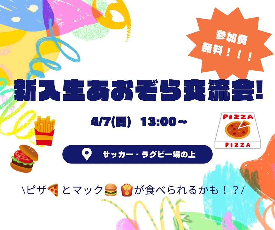 【新入生あおぞら交流会️】 4/7(日)13:00〜 @サッカー・ラグビー場の上あたり 「新入生あおぞら交流会」開催します!参加費はもちろん無料! ピザとマックを用意してお待ちしています!🏻たくさん食べながらみんなでお話も楽しみましょう!🗣️💭 男女問わず、同じ学部、違う学部の人とも友達になれるチャンスです!🤝🏻 ぜひアメフト部の新歓に参加してみませんか🏻 途中参加・退出OK🏻 参加連絡はDMまで!飛び入り参加も大歓迎です!‍♀️ サッカー・ラグビー場辺りに部員がいるので、ぜひ足を運んでみて下さい!‍♂️ ┈┈┈┈┈┈┈┈┈ アメフト部への見学・体験いつでもお待ちしています🏻 1人でも、お友だちとでも、途中参加・退出ももちろんOKです!見学の場合は私服で、体験の場合はぜひ動きやすい格好でお越しください! ※練習日時は変更する場合があります。見学・体験を希望する方はぜひDMへご連絡ください 新歓期間練習 晴天時:五十嵐キャンパス サッカー・ラグビー場 雨天時:五十嵐キャンパス第2体育館Bフロア 日時:水~金 17:00~    土日 9:00~12:00 質問などもDM・ハイライトの質問箱でいつでも受け付けています! アメフト部のことだけでなく新生活に関することなど、どんな些細なことでもお気軽にご連絡ください🏻 #