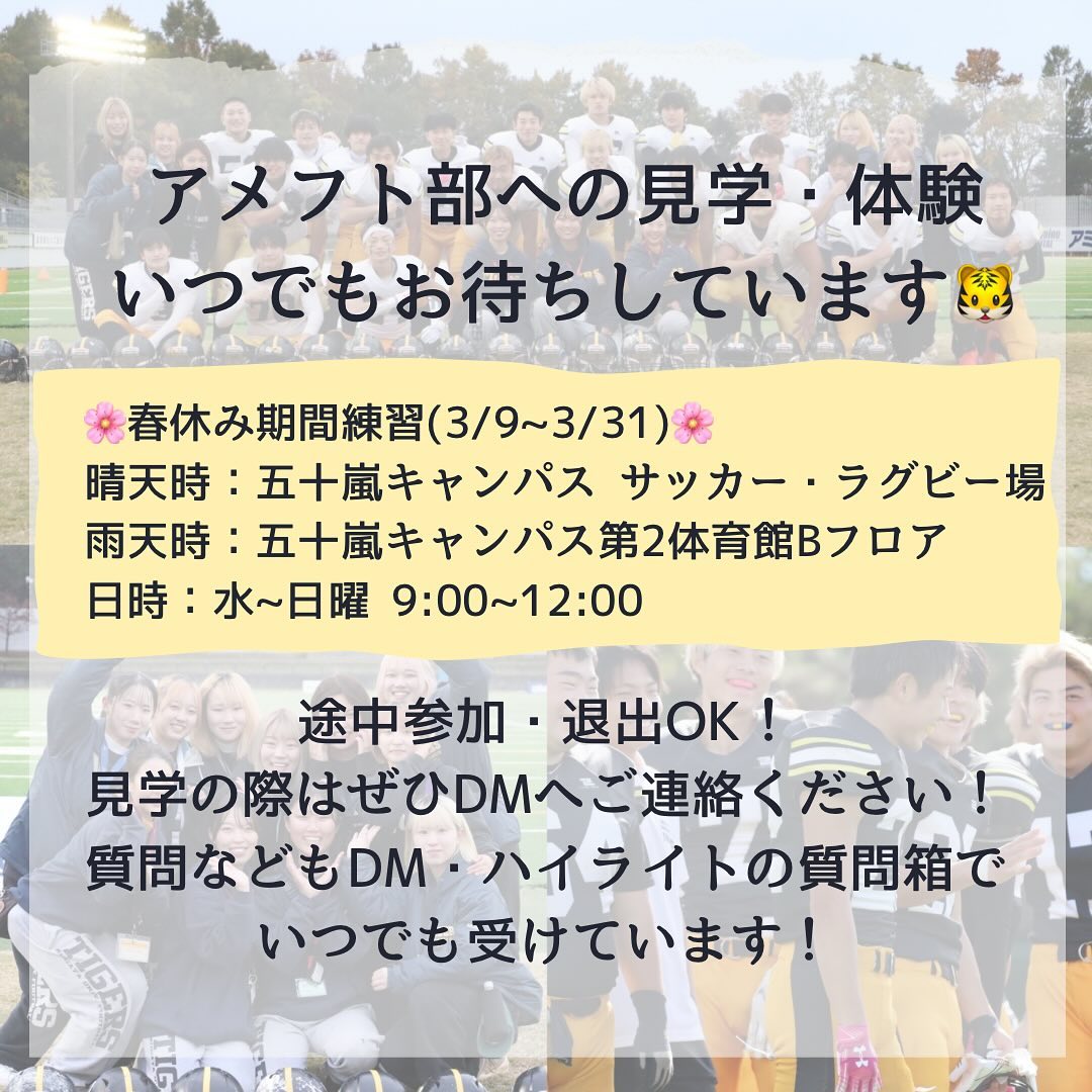 【現役新大生に聞く!大学生活必需品2024】 新潟大学に合格された皆さん!おめでとうございます 今回は新生活が始まる前に揃えておくと良い「大学生活必需品・春編」をご紹介します! ①パソコン 持ち運ぶことを考えて、とにかく「薄くて」「軽い」ものを選びましょう!性能はあまり気にしなくてOK。 ②電気ケトル🫖 お茶、コーヒー、カップスープ、カップラーメンなど何かと使います。 ③自転車 新大周辺からスーパーまでは微妙に遠く、また新大は敷地が広いため学内の移動も自転車があると便利です。アメフト部は9割以上の部員が自転車を持っています!歩くのが苦でない人はなくても大丈夫🏻 ④テレビ YouTubeやNetflix、Amazon prime等に対応したテレビを買いましょう!! ⑤普通の傘と折り畳み傘☂️ 新潟は風が強く急に雨が降ってくることも多いです。風に強い傘を買うのもいいですが、ビニール傘のしなりを活かす方が長持ちするかもしれません。普通の傘はよく取り違えられることがあるので、予備も買っておきましょう。 ⑥取っ手が取れるフライパン&鍋 収納もしやすく、冷蔵庫にもそのまま入れられます。 ⑦腕時計 ほぼ全ての講義室に時計がないので、試験時に困ります。 ⑧プリンターorタブレット 先生は授業資料をデータで送ってくださることもしばしば。 その資料を紙媒体で利用・保存・書き込みをしたい人はプリンターがおすすめ。 データで管理しタブレット上で書き込んだり整理したい人はタブレットがおすすめ。 (もちろんどちらも無くてもやっていけます!!) ┈┈┈┈┈┈┈┈┈┈ アメフト部への見学・体験いつでもお待ちしています🏻 1人でも、お友だちとでも、途中参加・退出ももちろんOKです!見学の場合は私服で、体験の場合はぜひ動きやすい格好でお越しください! ※練習日時は変更する場合があります。見学・体験を希望する方はぜひDMへご連絡ください 春休み期間練習(3/9~3/31) 晴天時:五十嵐キャンパス サッカー・ラグビー場 雨天時:五十嵐キャンパス第2体育館Bフロア 日時:水~日曜 9:00~12:00 質問などもDM・ハイライトの質問箱でいつでも受け付けています! アメフト部のことだけでなく新生活に関することなど、どんな些細なことでもお気軽にご連絡ください🏻