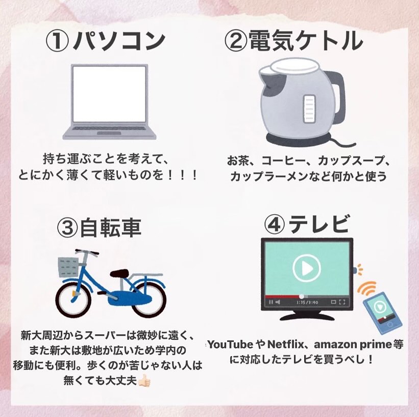 【現役新大生に聞く!大学生活必需品2025】 新潟大学に合格された皆さん!おめでとうございます 今回は新生活が始まる前に揃えておくと良い「大学生活必需品・春編」をご紹介します! ①パソコン 持ち運ぶことを考えて、とにかく「薄くて」「軽い」ものを選びましょう!性能はあまり気にしなくてOK。 ②電気ケトル🫖 お茶、コーヒー、カップスープ、カップラーメンなど何かと使います。 ③自転車 新大周辺からスーパーまでは微妙に遠く、また新大は敷地が広いため学内の移動も自転車があると便利です。アメフト部は9割以上の部員が自転車を持っています!歩くのが苦でない人はなくても大丈夫🏻 ④テレビ YouTubeやNetflix、Amazon prime等に対応したテレビがオススメです! ⑤普通の傘と折り畳み傘☂️ 新潟は風が強く急に雨が降ってくることも多いです。風に強い傘を買うのもいいですが、ビニール傘のしなりを活かす方が長持ちするかもしれません。普通の傘はよく取り違えられることがあるので、予備も買っておきましょう。 ⑥取っ手が取れるフライパン&鍋 収納もしやすく、冷蔵庫にもそのまま入れられます ⑦腕時計️ ほぼ全ての講義室に時計がないので、試験時に腕時計があると便利です! ⑧プリンターorタブレット 先生は授業資料をデータで送ってくださることもしばしば。 その資料を紙媒体で利用・保存・書き込みをしたい人はプリンターがおすすめ。 データで管理しタブレット上で書き込んだり整理したい人はタブレットがおすすめ。 (もちろんどちらも無くてもやっていけます!!) # ┈┈┈┈┈┈┈┈┈┈ 見学・体験いつでもお待ちしています🏻 1人でも、お友だちとでも、途中参加・退出ももちろんOKです!見学の場合は私服で、体験の場合はぜひ動きやすい格好でお越しください!動きやすい服がない場合は貸出も行います ※練習日時は変更する場合があります。見学・体験を希望する方はぜひDMへご連絡ください 春休み期間練習(3/9~3/31) 晴天時:五十嵐キャンパス サッカー・ラグビー場 雨天時:五十嵐キャンパス第2体育館Bフロア 日時:水~日曜 9:00~12:00 質問などもDMでいつでも受け付けています! アメフト部のことだけでなく新生活に関することなど、どんな些細なことでもお気軽にご連絡ください🏻
