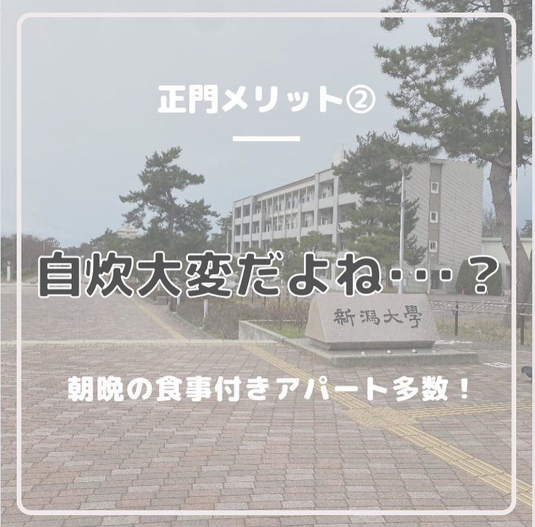 【現役新大生に聞く!新生活情報】 春から新大生のみなさん、ぜひアパート選びの参考にしてください 第2回目は”正門編”です! 〜メリット〜 ①『豊富な店揃え』 LAWSON、セブンイレブンなどのコンビニエンスストアはもちろん、すき家や松屋、Seria(百均)など様々なチェーン店が並んでいます!少し坂を下ればマクドナルドやカラオケまねきねこもあるので充実なぜかラーメン屋と薬局が特に多いです ②『自炊大変だよね…?』 朝と晩のご飯付きのでアパート多数栄養バランスの取れた日替わりのメニューでお腹いっぱいになれます自炊が面倒な時に助かること間違いなし! ③『駅に近い』 正門エリアは新潟大学前駅まで平均5~10分程度なので好アクセスなんです電車でバイトや遊びに行く時は遅刻しづらいかもしれません? 〜デメリット〜 ①『家賃が高い…』 利便性が高かったりご飯付きだったりする分、家賃は少し高めでもその分暮らしやすさはダントツです ②『駅に近いと大学が遠くなる』 大学から新潟大学前駅まで距離があるので駅に近いと大学が遠くなるというジレンマが?駅に近い人は少し早起きしないと遅刻しちゃうかも? 次回は“中門編“です!お楽しみに #