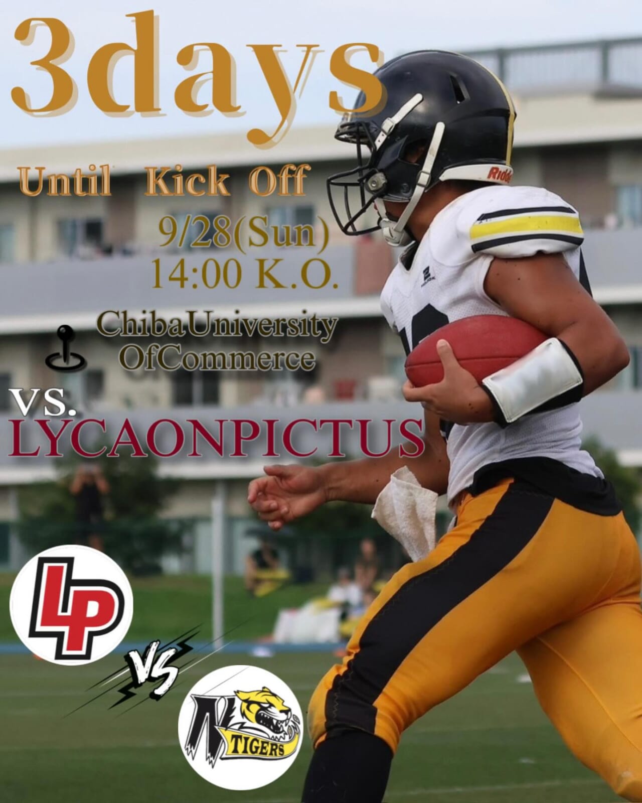 【第2節 千葉商科大学戦まで残り3日】 Chiba University of Commerce LYCAONPICTUS 9/28(sun) 14:00 kick off 千葉商科大学戦まで残り3日となりました! 練習に参加してくださるOBの皆様や、ご支援くださる保護者の皆様、そして応援してくださる全ての方のため、全力で勝利を掴みにいきます🏻 温かなご声援のほど、よろしくお願いいたします! ━━━━━━━━━━━━━━━ 〈試合詳細〉 〇日時 9/28(日)K.O. 14:00 〇会場 千葉商科大学市川 (千葉県市川市国府台1-3-1) 〜第2節 千葉商科大学戦をご観戦の皆様〜 第2節も大学会場のため、無料でご観戦いただけます。ご観戦の方は、【①お名前(代表者) ②人数 ③交通手段】をメール(niigata.tigers@gmail.com)にてご連絡ください 千葉商科大学の駐車場はご利用できかねますので、恐れ入りますが公共交通機関または、お近くのパーキングをご利用ください。 また、当日は観客用ベンチの数に限りがございます。椅子やレジャーシートなどをご持参いただける方はお持ちいただきますようお願い申し上げます。 #