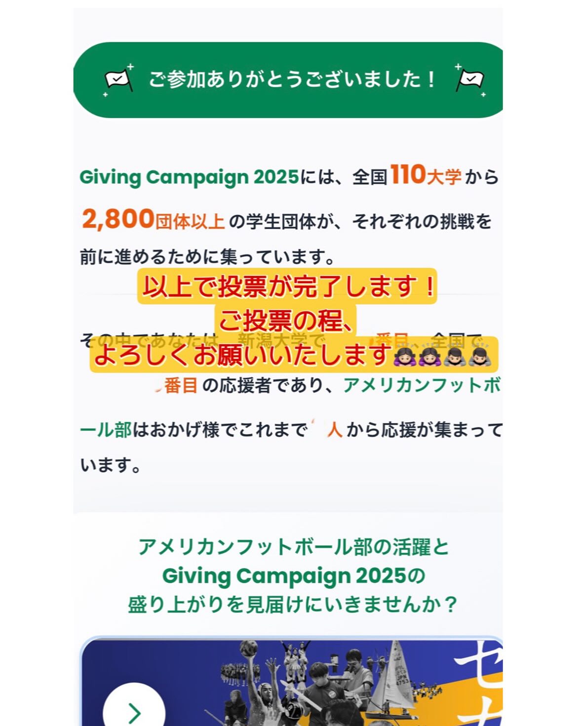 - 【️GivingCampaign投票手順🗳】 本日よりGivingCampaign2025が始まりました🏻 今回の投稿では、投票の手順についてご案内します🏻♀️ ぜひご投票の程、よろしくお願いします 投票は以下のリンク、またはハイライトから https://niigata-u.2025.giving-campaign.jp/groups?group=0d9a7dd5-080e-48fa-ba35-2b56dfe2c74a&image-type=group-ad&group-id=0d9a7dd5-080e-48fa-ba35-2b56dfe2c74a @gc_japan_univ #