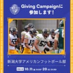 - 【 に参加します!】【明日から開催】 日頃から、たくさんのご支援・ご声援誠にありがとうございます。 新潟大学の学生団体を応援するオンラインチャリティーイベントが10/11-10/20に開催されます! 私たち新潟大学アメリカンフットボール部TIGERS(@niigata.tigers)も参加するため、イベント期間中、積極的に活動の様子をお届けします 1人1団体のみ!1分で投票完了! ■ 本キャンペーン概要 「Niigata University Giving Campaign 2024」は、新潟大学の学生団体を支援するためのオンラインチャリティーイベントです。協賛企業から集まった寄付金が、皆さまの投票を通じて各団体に配分されます。 ■ 皆さまへのお願い 新潟大学アメリカンフットボール部TIGERSに【投票】をお願いします! さらに、このキャンペーンをお友達やご家族にシェアしていただけると、とても助かります! ■ 投票・寄付サイトへのリンク(所要時間:約1分) 【https://niigata-u.2024.giving-campaign.jp/groups?id=c18442f3-04be-409e-b39c-3cdea51280a6】 (10/11 9:00より投票・寄付が可能です) 私たちTIGERSは昨年度のGivingCampaignではランキング2位という結果に終わりましたが、今年こそは1位を本気で目指します ぜひ投票にご協力をお願いいたします! #