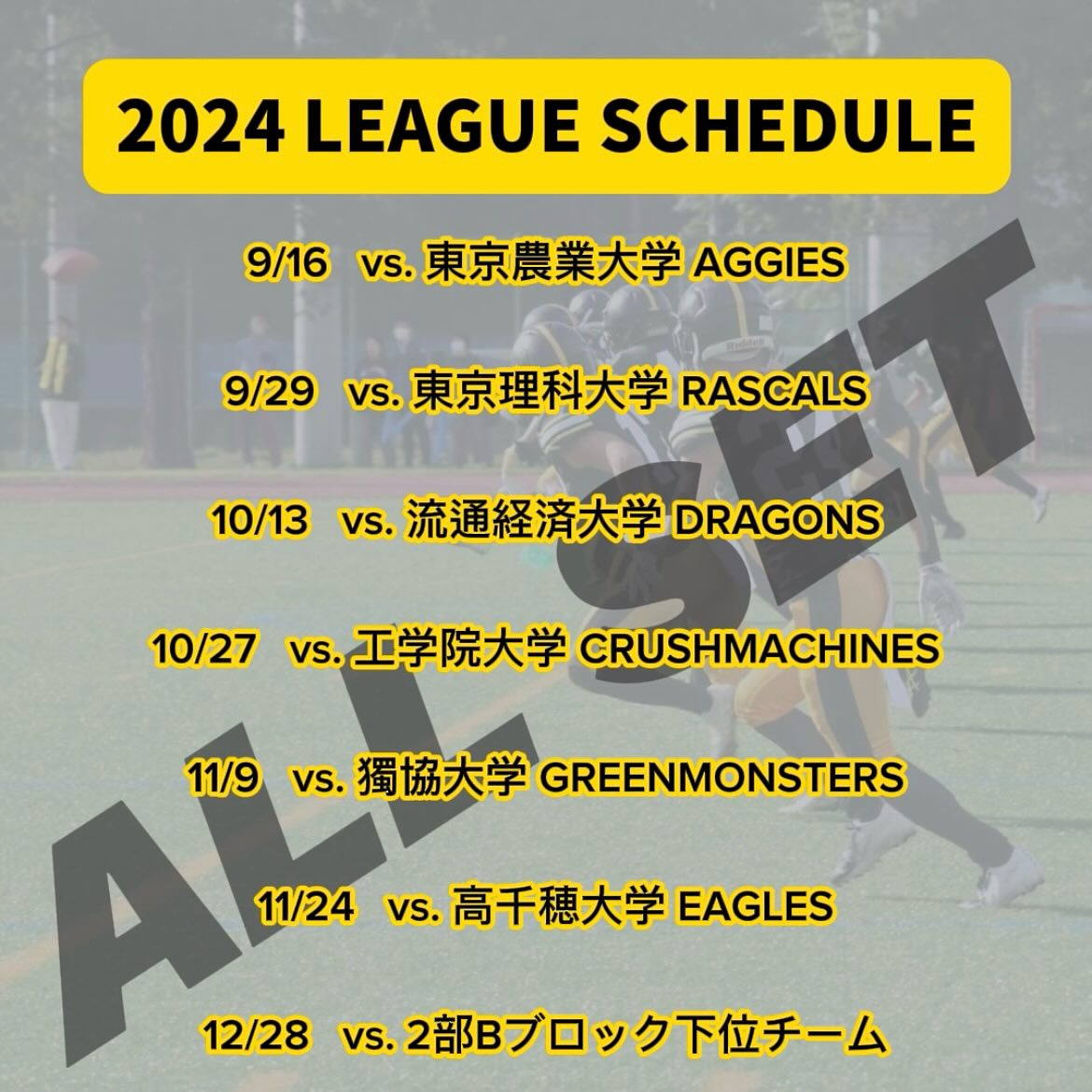 【2024 リーグ戦日程】 先日、今年度シーズンのリーグ戦試合日程が発表されました! 〜3部Dブロック〜 ★第1節★ 9/16(月) vs 東京農業大学 Kick off 12:30 @アミノバイタルフィールド ★第2節★ 9/29(日)vs 東京理科大学 Kick off 17:00 @駒沢第二球技場 ★第3節★ 10/13(日) vs 流通経済大学 Kick off 未定 @流通経済大学龍ケ崎 ★第4節★ 10/27(日) vs 工学院大学 Kick off 14:00 @工学院大学八王子 ★第5節★ 11/9(土) vs 獨協大学 Kick off 未定 @獨協大学草加 ★第6節★ 11/24(日)vs 高千穂大学 Kick off 11:00 @工学院大学八王子 ★入れ替え戦★ 12/28(土)vs 2部Bブロック下位チーム Kick off 未定 @アミノバイタルフィールド 詳しくは、関東アメリカンフットボール連盟公式HPをご覧下さい‍♀️ https://www.kcfa.jp/ なお、キックオフ時間が未定の試合は、分かり次第本アカウントにてお知らせ致します🗣 観戦希望の方は【①お名前(代表者) ②人数 ③交通手段】をメール(niigata.tigers@gmail.com)にてご連絡下さい️ 今年度も皆様のご声援を宜しくお願い致します。 #