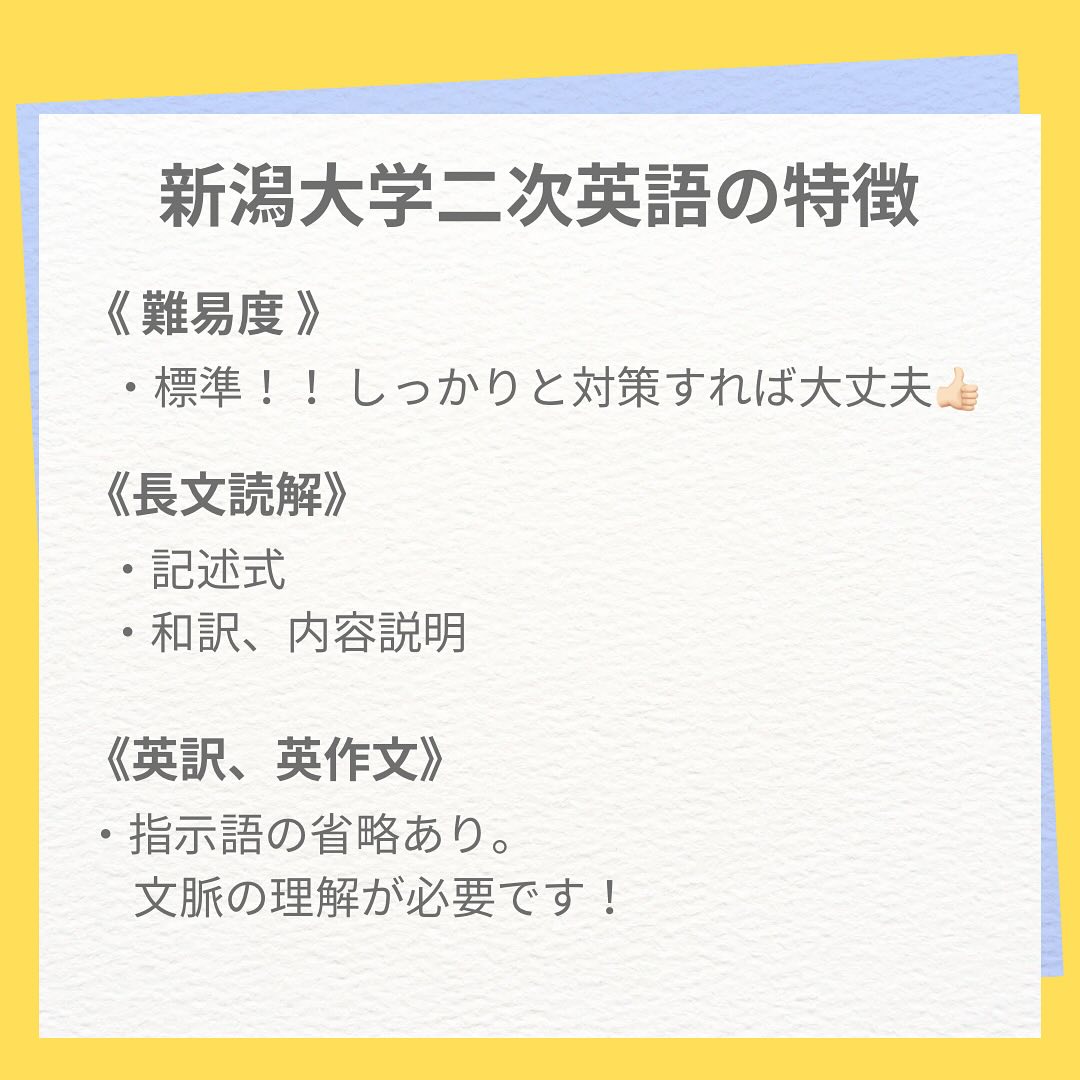 【2025新潟大学 前期二次試験対策】 〜英語編〜 これから始まる前期二次試験に向けて、現役新大生であるアメフト部が、二次試験のポイントをお教えします🏻 ̖́- 是非参考にしてみてください! 新潟大学アメフト部は、受験生の皆さんを応援しています 最後まで、粘り強く対策を進めましょう! 公式アカウント→ @niigata.tigers 新歓アカウント→ @tigers_recruit_ #