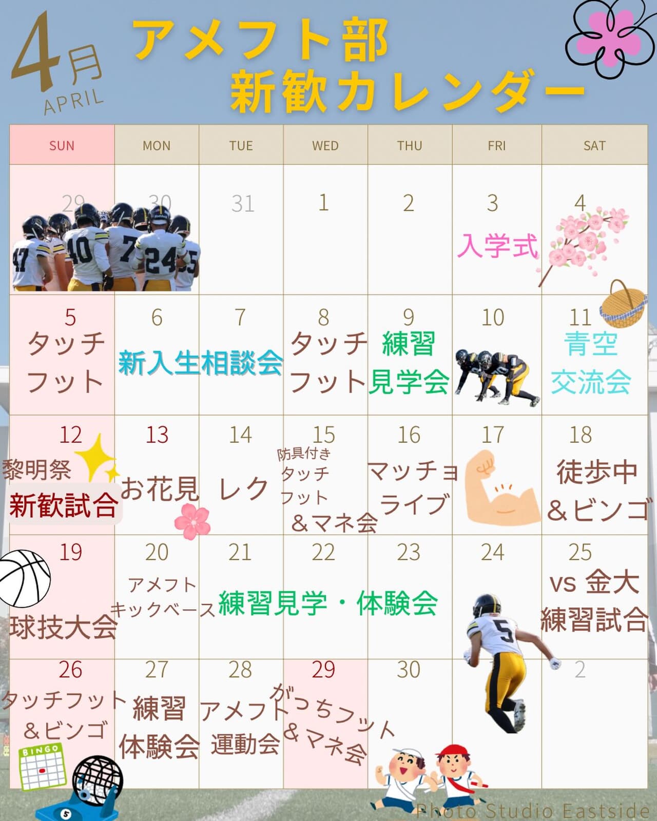 【4月新歓カレンダー】 新大アメフト部TIGERSの新歓がスタートします!様々なイベントを用意し、新入生の皆様と会えるのを楽しみにしています️ アメフトを誰でも参加しやすくしたタッチフットや、アメフトキックベースなど、部員と一緒に体を動かせるイベントがたくさん! また、普段の練習を見学できたり、マネ会でマネージャーと仲良くなったり……運動が苦手な方や長居ができない日でも楽しめるイベントもあります アメフトに詳しくなくても、運動が苦手でも、全く問題ありません!TIGERSの部員一同、全力で楽しい時間をお届けします 4月の新歓イベントでお待ちしています ーーーーーーー 見学・体験いつでもお待ちしています🏻 1人でも、お友だちとでも、途中参加・退出ももちろんOKです!見学の場合は私服で、体験の場合はぜひ動きやすい格好でお越しください!動きやすい服がない場合は貸出も行います ※練習日時は変更する場合があります。見学・体験を希望する方はぜひDMへご連絡ください! 練習詳細 晴天時:五十嵐キャンパス サッカー・ラグビー場 雨天時:※練習時間、練習場所が変わる可能性があります。見学・体験希望の方はDMまでお問い合わせお願いいたします!🏻‍♀️ 日時:火〜木曜 17:00~ 土・日曜 9:00~ 質問などもDMでいつでも受け付けています! アメフト部のことだけでなく新生活に関することなど、どんな些細なことでもお気軽にご連絡ください!