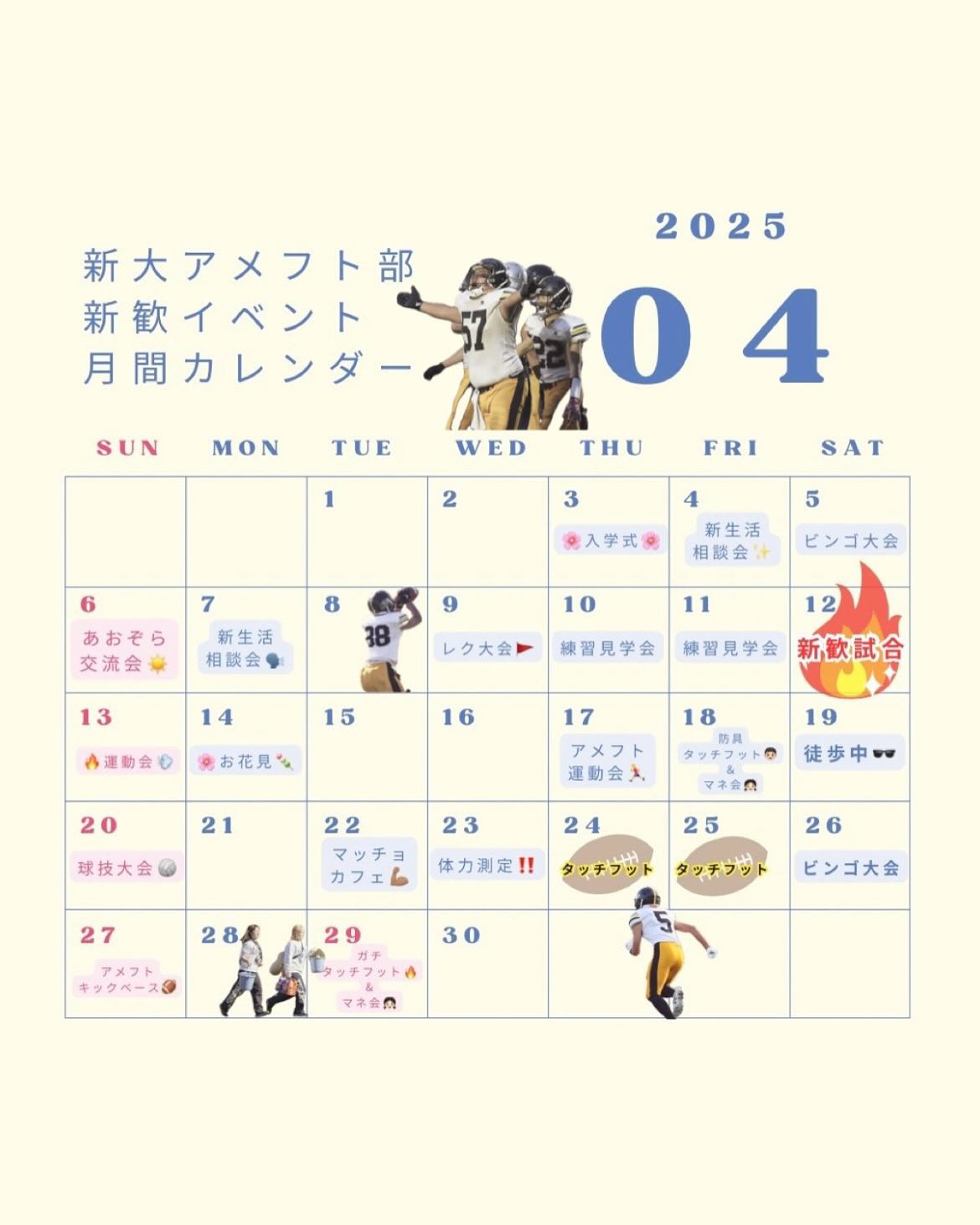【4月新歓カレンダー】 新大アメフト部TIGERSの新歓がスタートしています‍♂️ 様々なイベントを用意して、新入生の皆様をお待ちしております! 4/12(土)の黎明祭では新歓試合を行います!毎年盛り上がるこの試合は必見ですアメフト部のかっこいい一面が見られるかも️ 体を動かすイベントもあるので、久しぶりに運動したい新入生の皆様は要チェックですもちろん運動が苦手な方も楽しめるイベントとなっておりますのでお気軽にご参加ください! 他にもイベントをたくさんご用意していますのでお楽しみに🏻 ┈┈┈┈┈┈┈┈┈┈ 見学・体験いつでもお待ちしています🏻 1人でも、お友だちとでも、途中参加・退出ももちろんOKです!見学の場合は私服で、体験の場合はぜひ動きやすい格好でお越しください!動きやすい服がない場合は貸出も行います ※日時は変更する場合があります。見学・体験を希望する方はぜひDMへご連絡ください 新歓期間練習 晴天時:五十嵐キャンパス サッカー・ラグビー場 雨天時:五十嵐キャンパス第2体育館Bフロア 日時:水~金曜 17:00~ 土・日曜 9:00~12:00 質問などもDMでいつでも受け付けています! アメフト部のことだけでなく新生活に関することなど、どんな些細なことでもお気軽にご連絡ください🏻 #