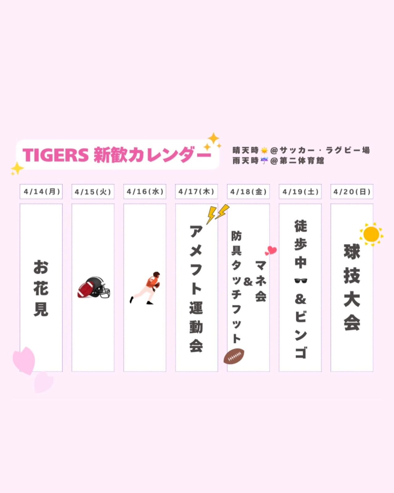 【4月3週目カレンダー🗓️】4/14-4/20 4月後半もアメフト部はたくさんのイベントを行なっております! 4/18(金)は防具タッチフット&マネ会 男の子は、安全で簡単にアメフトの世界を体感できるタッチフットに参加して、チーム対抗戦に挑もう🏻 女の子は、マネージャーと一緒に楽しくおしゃべりしたりレクをしたりして盛り上がろう新生活のお悩み相談やマネージャー業務に関する質問ももちろん待ってます! 4/19(土)は徒歩中&ビンゴ大会! 逃走中🕶️ではなく、アメフト部の新企画「徒歩中」を行います!部員と協力してハンターから逃げ切ろう そして、前回は30人以上の新入生が参加してくれた大人気企画!ビンゴ大会も行います!ぜひきてね 4/20(日)は球技大会!毎年盛り上がるこのイベントに参加して友達作ろう!運動不足も解消できるかも🏐 イベント後はおいしいごはんに連れて行ってもらえます 各イベントの詳細は投稿・ストーリーをチェック! 運動系のイベントにはぜひ動きやすい格好でお越しください また、球技大会は体育館開催のため、上履きのご持参をお願いいたします(服・靴の貸し出しも行っております) 質問等はDMまで ┈┈┈┈┈┈┈┈┈┈ 見学・体験いつでもお待ちしています🏻 1人でも、お友だちとでも、途中参加・退出ももちろんOKです!見学の場合は私服で、体験の場合はぜひ動きやすい格好でお越しください!動きやすい服がない場合は貸出も行います ※日時は変更する場合があります。見学・体験を希望する方はぜひDMへご連絡ください 新歓期間練習 晴天時:五十嵐キャンパス サッカー・ラグビー場 雨天時:五十嵐キャンパス第2体育館Bフロア 日時:水~金曜 17:00~ 土・日曜 9:00~12:00 質問などもDMでいつでも受け付けています! アメフト部のことだけでなく新生活に関することなど、どんな些細なことでもお気軽にご連絡ください🏻 #