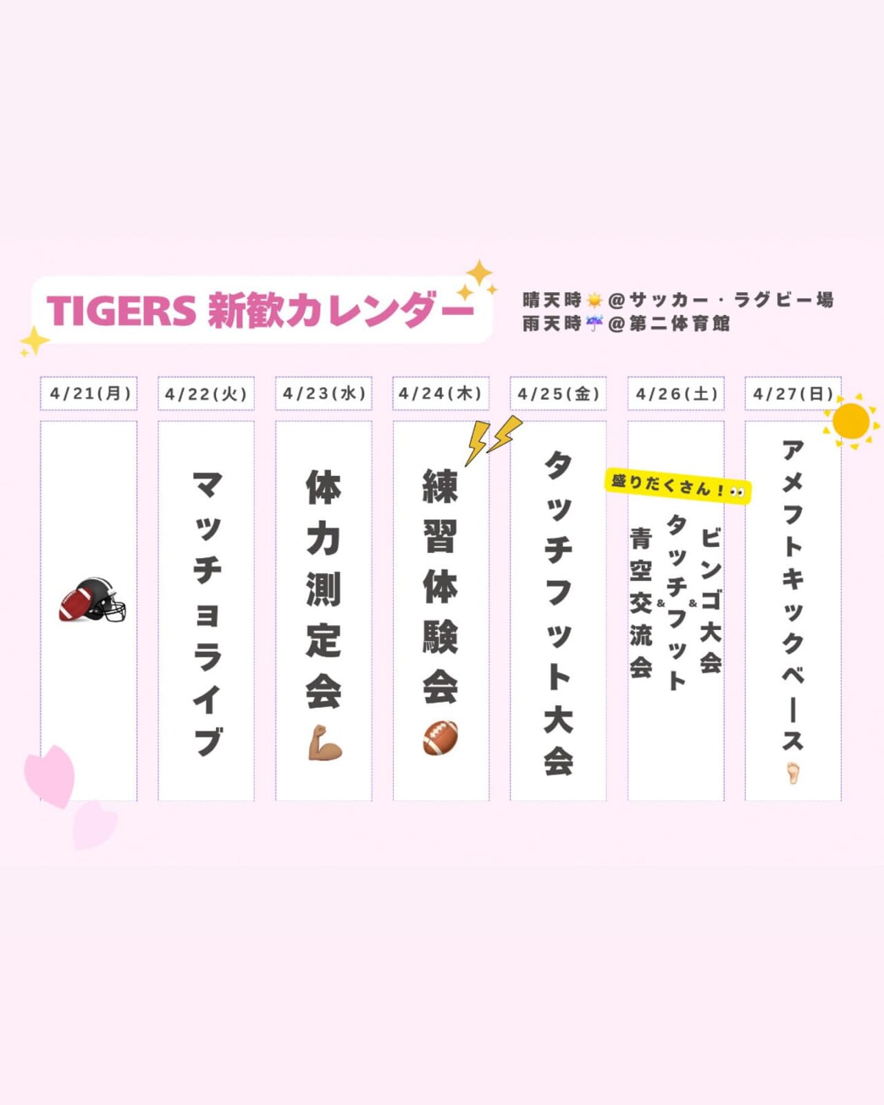 【4月4週目カレンダー🗓️】4/21-27 いよいよ4月も終わりに近づいてきました!アメフト部はまだまだたくさんのイベントをご用意しております 4/24(木)は練習体験会!!普段の練習の体験や、マネージャー体験もすることができます!アメフト部が気になっている方は要チェックです🏻 4/25(金)は毎回大盛り上がりするタッチフットの大会!簡易版アメフトで安全に楽しく遊ぼう 4/26(土)は青空交流会、タッチフット、ビンゴ大会と大人気企画が盛りだくさんです!どのイベントも楽しいこと間違いなし 4/27(日)はアメフトキックベース🦶🏻アメフトはやったことないけどキックはできる!キックベースやりたい!という方におすすめ!土日に行うイベントとしては最後なのでぜひご参加ください 運動系のイベントには動きやすい格好でお越しください(靴や服の貸し出しも行っております🏻) そろそろ新歓も終わりに近づいています!ぜひぜひ一度はアメフト部の新歓にお越しください🏽 ┈┈┈┈┈┈┈┈┈┈ 見学・体験いつでもお待ちしています🏻 1人でも、お友だちとでも、途中参加・退出ももちろんOKです!見学の場合は私服で、体験の場合はぜひ動きやすい格好でお越しください!動きやすい服がない場合は貸出も行います ※日時は変更する場合があります。見学・体験を希望する方はぜひDMへご連絡ください 新歓期間練習 晴天時:五十嵐キャンパス サッカー・ラグビー場 雨天時:五十嵐キャンパス第2体育館Bフロア 日時:水~金曜 17:00~ 土・日曜 9:00~12:00 質問などもDMでいつでも受け付けています! アメフト部のことだけでなく新生活に関することなど、どんな些細なことでもお気軽にご連絡ください🏻 #