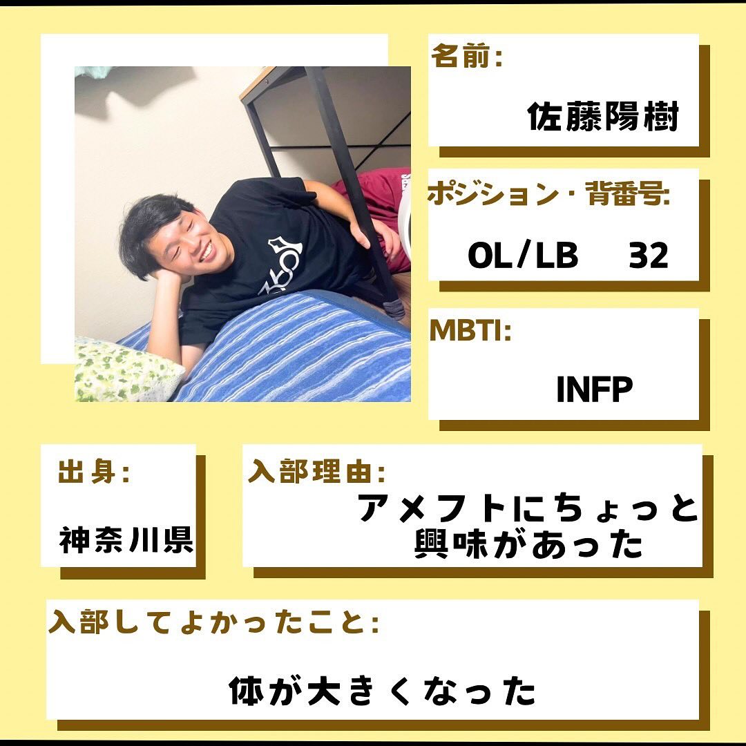 【TIGERS 2025 部員紹介】 新2年選手編 『アメフト部で1番の鶏肉消費量』 佐藤陽樹 ・出身:神奈川 ・MBTI:INFP ・中学部活:ソフトテニス ・高校部活:山岳 ・学部・学年:工学部・2年 ・ポジション:LB/OL ・入部理由:アメフトにちょっと興味があった ・入部してよかったこと:体が大きくなった ・新大近くのおすすめご飯屋さん:よしだ屋 ・アルバイト:回転寿司キッチン #