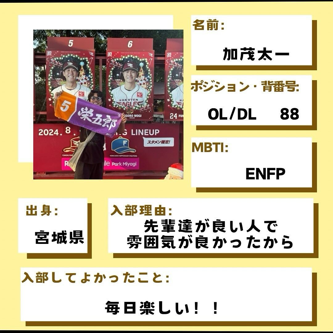 【TIGERS 2025 部員紹介】 新2年選手編 『アメフト部の涙腺担当』 加茂太一 ・出身:宮城 ・MBTI:ENFP ・中学部活:野球 ・高校部活:生徒会執行部   ちょっと軽音 ・学部・学年:工学部 2年 ・ポジション:OL/DL ・入部理由:先輩達が良い人で雰囲気が良かったから ・入部して良かったこと:毎日楽しい!! ・ご飯屋さん:こさか ・アルバイト:そろそろやる予定 #