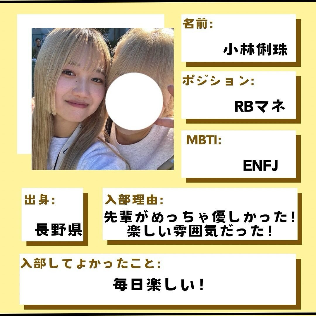 - 【TIGERS 2025 部員紹介】 新3年スタッフ編 『アメフト部で1番首がすわってない!』 MG 小林俐珠 ・出身:長野県 ・MBTI:ENFJ ・中学部活:ソフトテニス ・高校部活:バドミントン ・学部・学年:人文学部・3年 ・ポジション:RBマネージャー ・入部理由:先輩がめっちゃ優しかった!楽しい雰囲気だった! ・入部してよかったこと:毎日楽しい! ・新大近くのおすすめご飯屋さん:けんけん、味濱家 ・アルバイト:塾講師 #