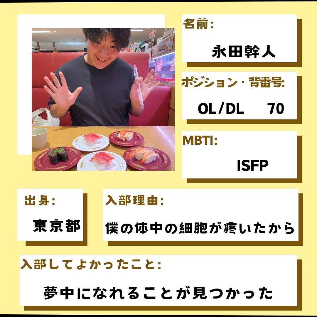 【TIGERS 2025 部員紹介】 新4年選手編② 『アメフト部で1番の配送力(7人)の持ち主』 永田幹人 ・出身:東京都 ・MBTI:ISFP ・中学部活:テニス ・高校部活:ラグビー ・学部・学年:農学部・4年 ・ポジション:OL/DL ・入部理由:僕の体中の細胞が疼いたから ・入部してよかったこと:夢中になれることが見つかった ・新大近くのおすすめご飯屋さん:吉田屋の唐揚げ ・アルバイト:塾、佐川急便 #