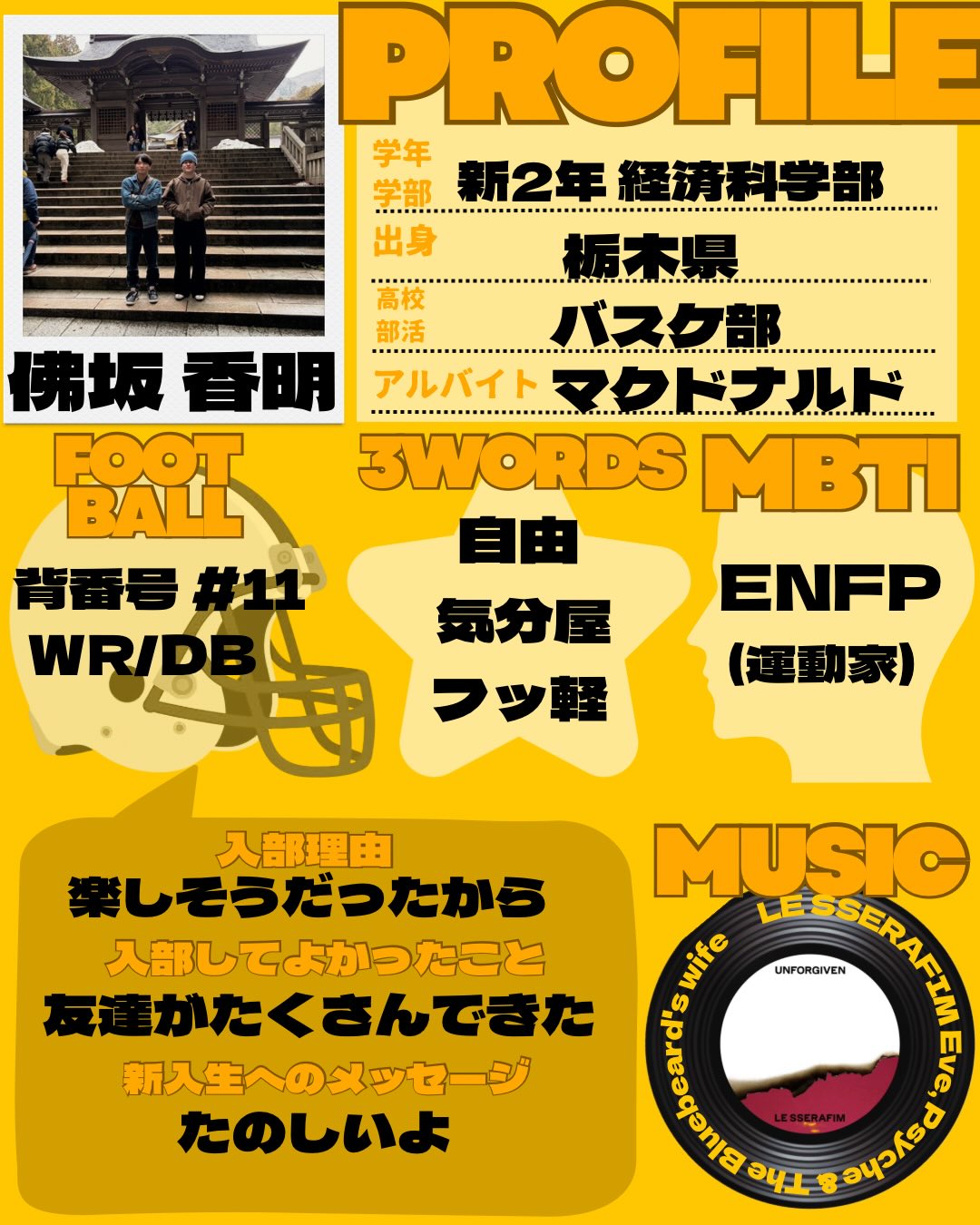 - 【TIGERS 2026 部員紹介】 新2年選手編④ 佛坂香明 自分を表す3つのワード ️自由 ️気分屋 ️フッ軽 ・出身:栃木県 ・MBTI:ENFP ・高校部活:バスケ ・学部・学年:経済科学部2年 ・ポジション:WR/DB ・入部理由:楽しそうだったから ・入部してよかったこと:友達がたくさんできた ・好きな曲: Eve,Psyche & The Bluebeard's wife ・アルバイト:マクドナルド 新入生へのメッセージ →たのしいよ