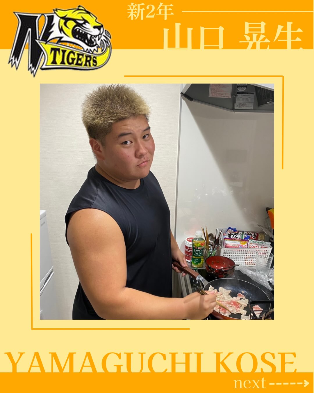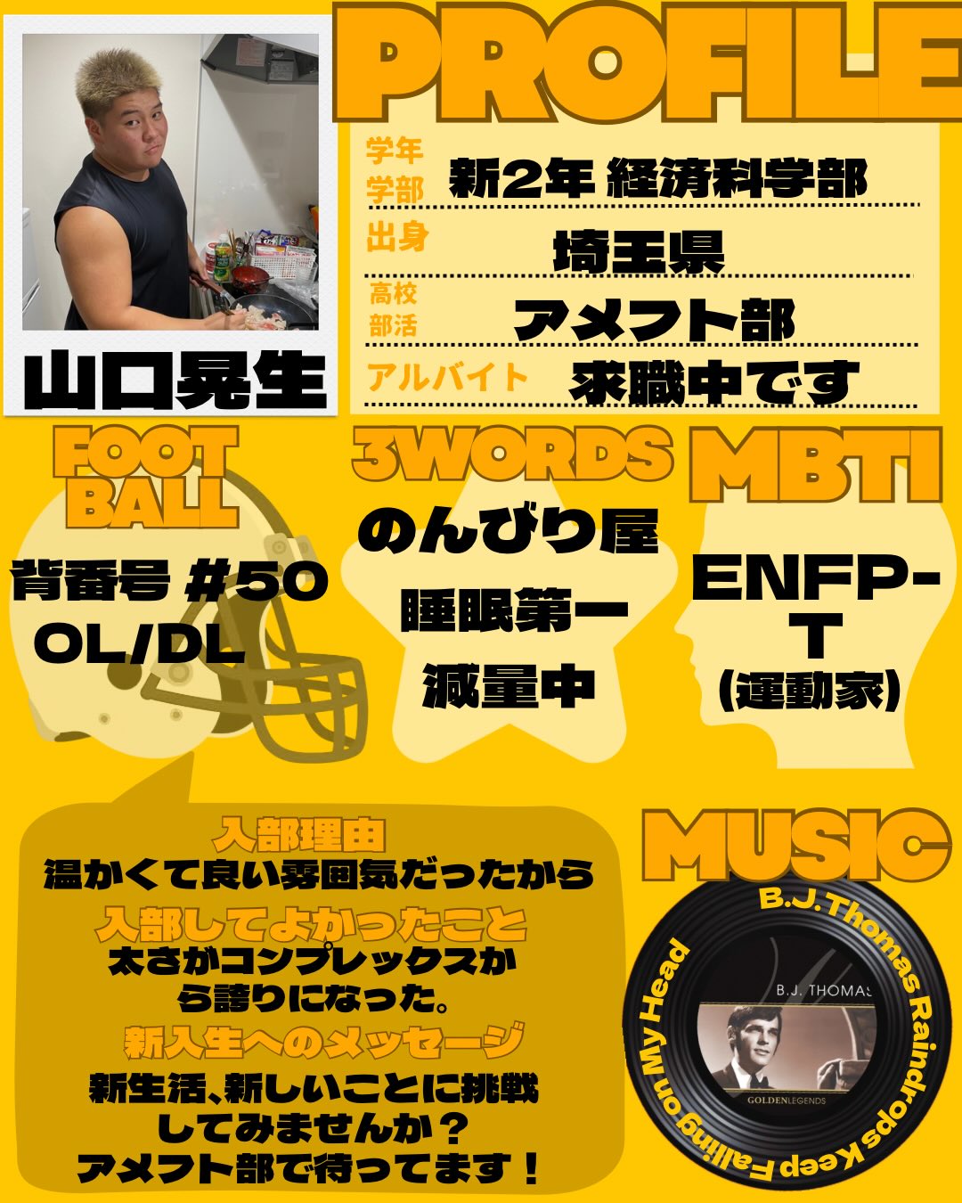 - 【TIGERS 2026 部員紹介】 新2年選手編⑤ 山口晃生 自分を表す3つのワード ️のんびり屋 ️睡眠第一 ️減量中 ・出身: 埼玉県 ・MBTI : ENFP-T ・高校部活 : アメリカンフットボール ・学部・学年 : 経済科学部2年生 ・ポジション : OL /DL ・入部理由 : 温かくて良い雰囲気だったから ・入部して良かったこと : 太さがコンプレックスから誇りになった。 ・好きな曲 : B.J.Thomas 『Raindrops Keep Fallin' On My Head』 ・アルバイト : 求職中です 新入生へのメッセージ →新生活、新しいことに挑戦してみませんか? アメフト部で待ってます!