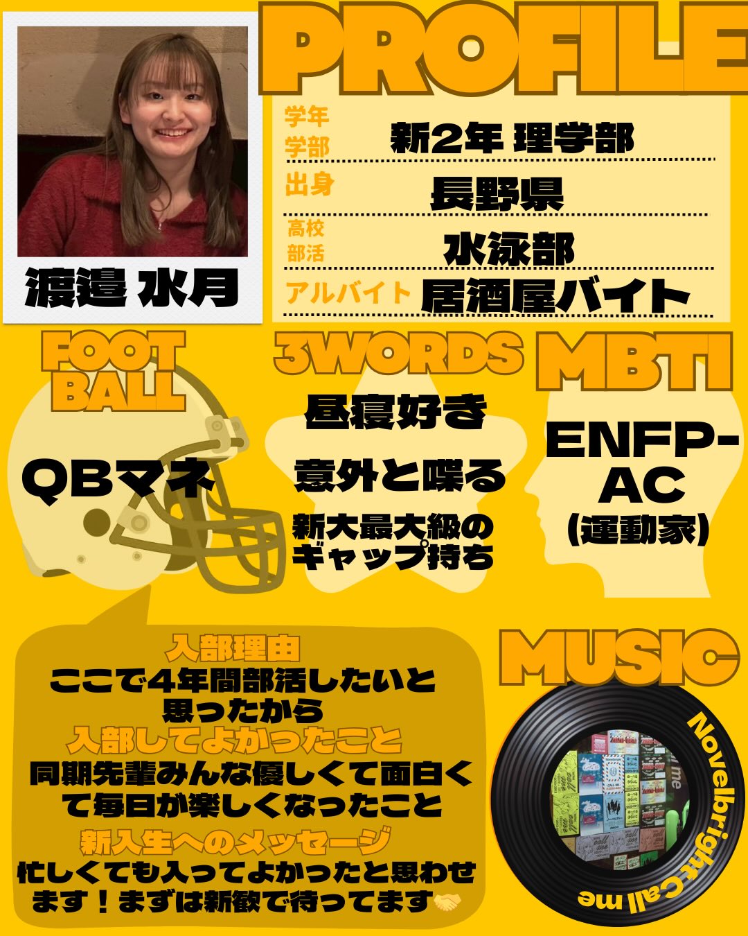 【TIGERS 2026 部員紹介】 新2年MG編② QBマネ 渡邉水月 自分を表す3つのワード ️昼寝好き ️意外と喋る ️新大最大級のギャップ持ち ・出身:長野 ・MBTI:ENFP(-AC) ・高校部活:水泳部 ・学部・学年:理学部・新2年 ・ポジション:QBマネ ・入部理由:ここで4年間部活したいと思ったから ・入部してよかったこと:同期先輩みんな優しくて面白くて毎日が楽しくなったこと ・好きな曲:Call me(novelbright) ・アルバイト:居酒屋バイト 新入生へのメッセージ →忙しくても入ってよかったと思わせます!まずは新歓で待ってます🤝