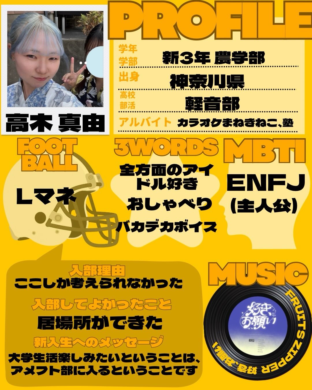 - 【TIGERS 2026 部員紹介】 新3年MG編② Lマネ 高木真由 自分を表す3つのワード ️全方面のアイドル好き ️おしゃべり ️バカデカボイス ・出身:神奈川 ・MBTI:ENFJ ・高校部活:軽音 ・学部・学年:農学部食品科学プログラム・3年 ・ポジション:Lマネージャー ・入部理由:ここしか考えられなかった ・入部してよかったこと:居場所ができた ・好きな曲:FRUITS ZIPPER「好き、お願い」 ・アルバイト:カラオケまねきねこ、塾 新入生へのメッセージ →大学生活楽しみたいということは、アメフト部に入るということです