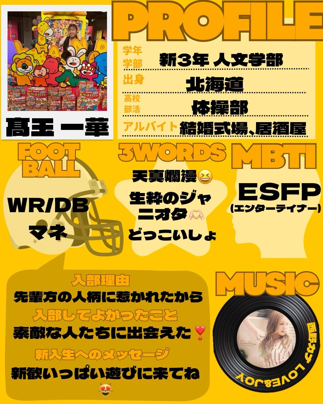 【TIGERS 2026 部員紹介】 新3年MG編③ WR/DBマネ 髙玉一華 髙玉一華(たかたま いちか) 自分を表す3つのワード ️天真爛漫 ️生粋のジャニオタ🫶🏻 ️どっこいしょ ・出身:北海道 ・MBTI:ESFP🕺 ・高校部活:体操部🤸‍♂️ ・学部・学年:人文学部・3年 ・ポジション:WR/DBマネージャー ・入部理由:先輩方の人柄に惹かれたから ・入部してよかったこと:素敵な人たちに出会えた❣️ ・好きな曲:LOVE&JOY/西野カナ ・アルバイト:結婚式場、居酒屋 新入生へのメッセージ →新歓いっぱい遊びに来てね