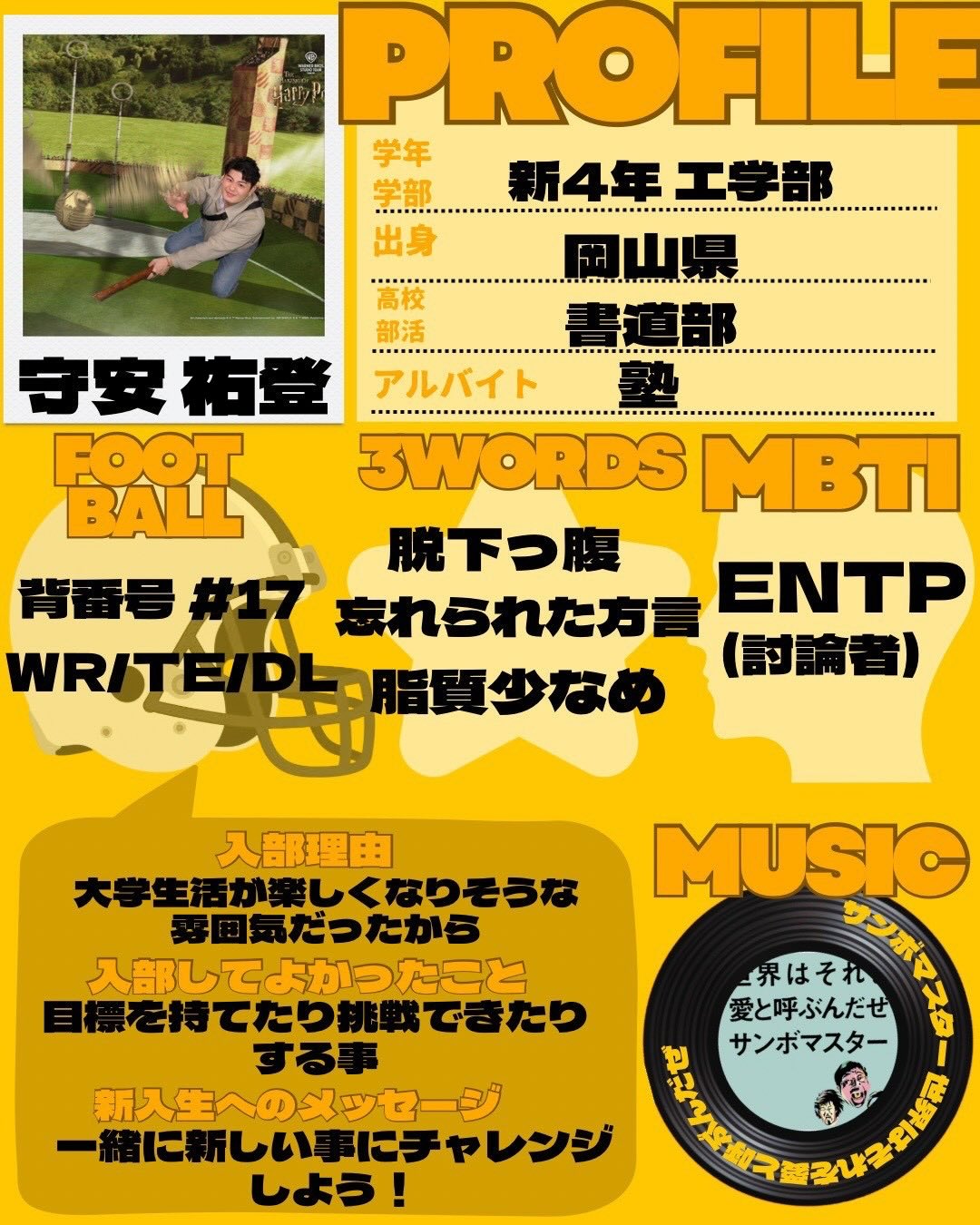 【TIGERS 2026 部員紹介】 新4年選手編③ 副主将 守安祐登 自分を表す3つのワード ️脱下っ腹 ️忘れられた方言 ️脂質少なめ ・出身:岡山県 ・MBTI:ENTP ・高校部活:書道 ・学部・学年:工学部・4年 ・ポジション:WR/TE/DL ・入部理由:大学生活が楽しくなりそうな雰囲気だったから ・入部してよかったこと:目標を持てたり挑戦できたりする事 ・好きな曲:世界はそれを愛と呼ぶんだぜ ・アルバイト:塾 新入生へのメッセージ →一緒に新しい事にチャレンジしよう!