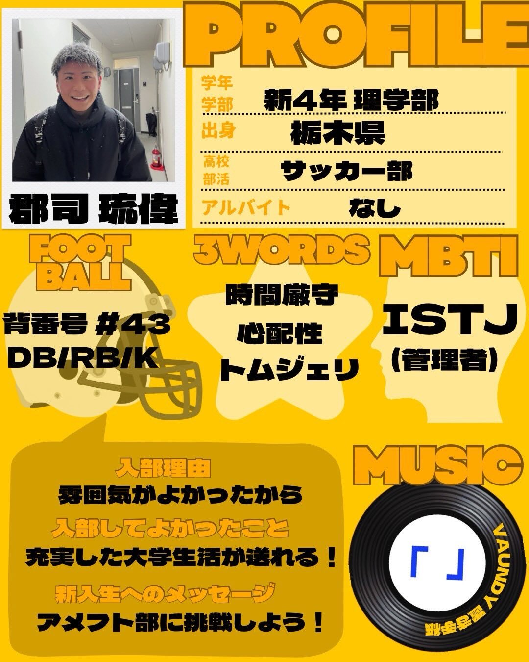 - 【TIGERS 2026 部員紹介】 本日より、アメフト部の部員を紹介します♀️ 個性溢れる部員たちの姿をぜひご覧下さい 新4年選手編① 主将 郡司琉偉 自分を表す3つのワード ️時間厳守 ️心配性 ️トムジェリ ・出身:栃木県那須塩原市 ・MBTI:ISTJ ・高校部活:サッカー ・学部・学年:理学部・理学科・数学プログラム・新4年 ・ポジション:DB/RB/K ・入部理由:雰囲気が良かったから ・入部してよかったこと:充実した大学生活がおくれる! ・好きな曲:「置き手紙」 Vaundy ・アルバイト:なし 新入生へのメッセージ →アメフト部に挑戦しよう!